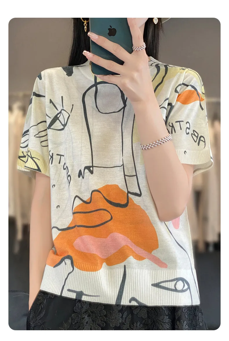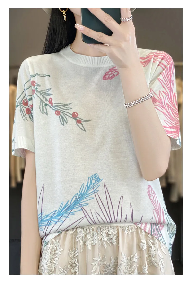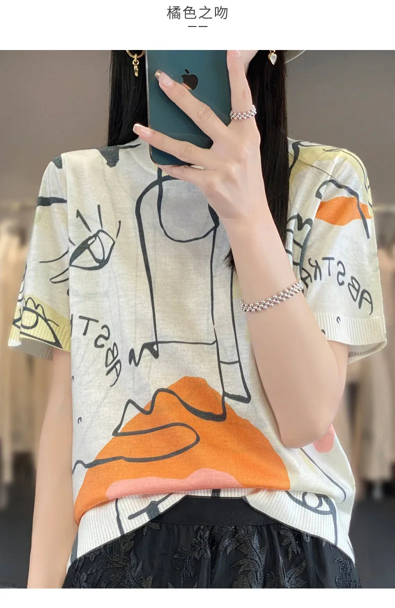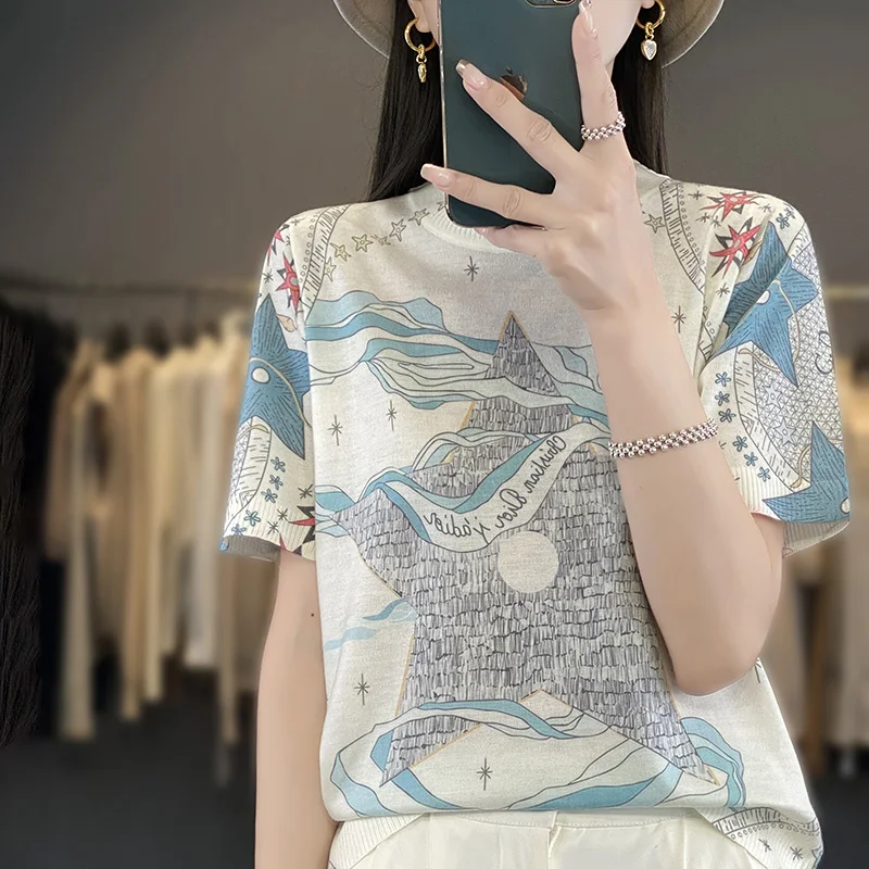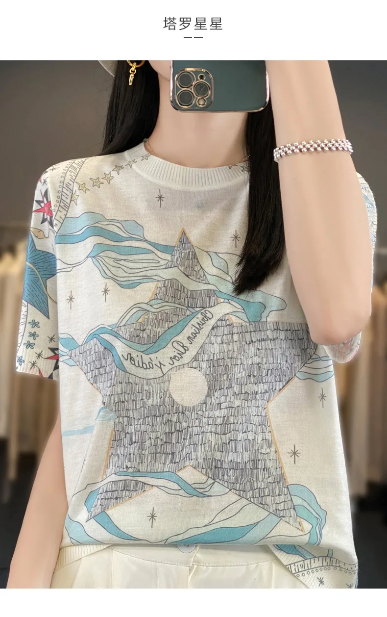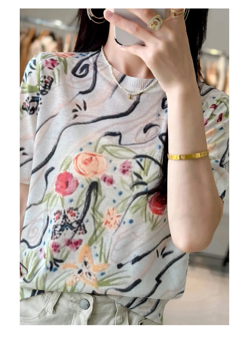 Thin Knitted Short-Sleeved Mulberry Silk T-Shirt In Summer With Women’s Wool Printed Half-Sleeve Loose Ice Silk Bottoming Shirt
