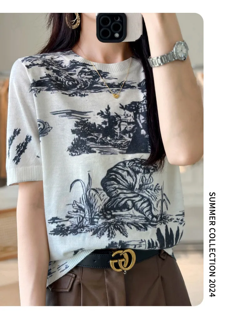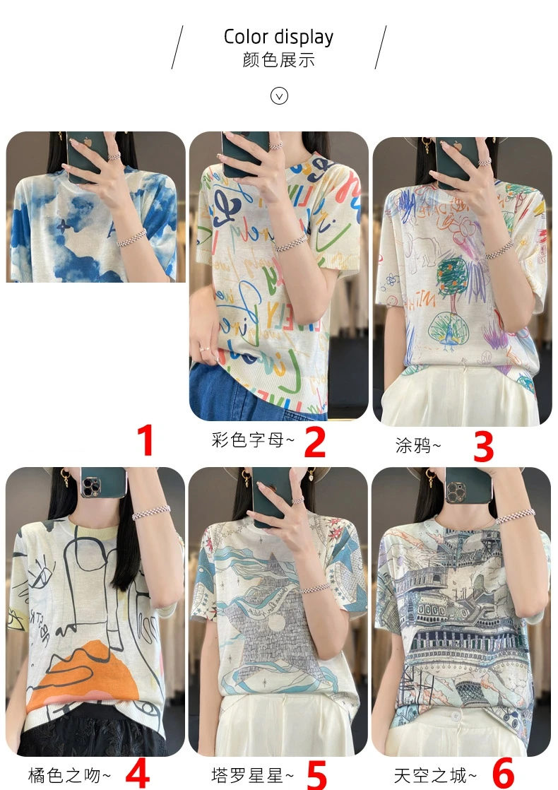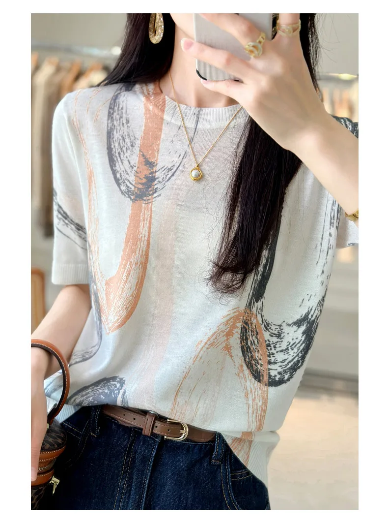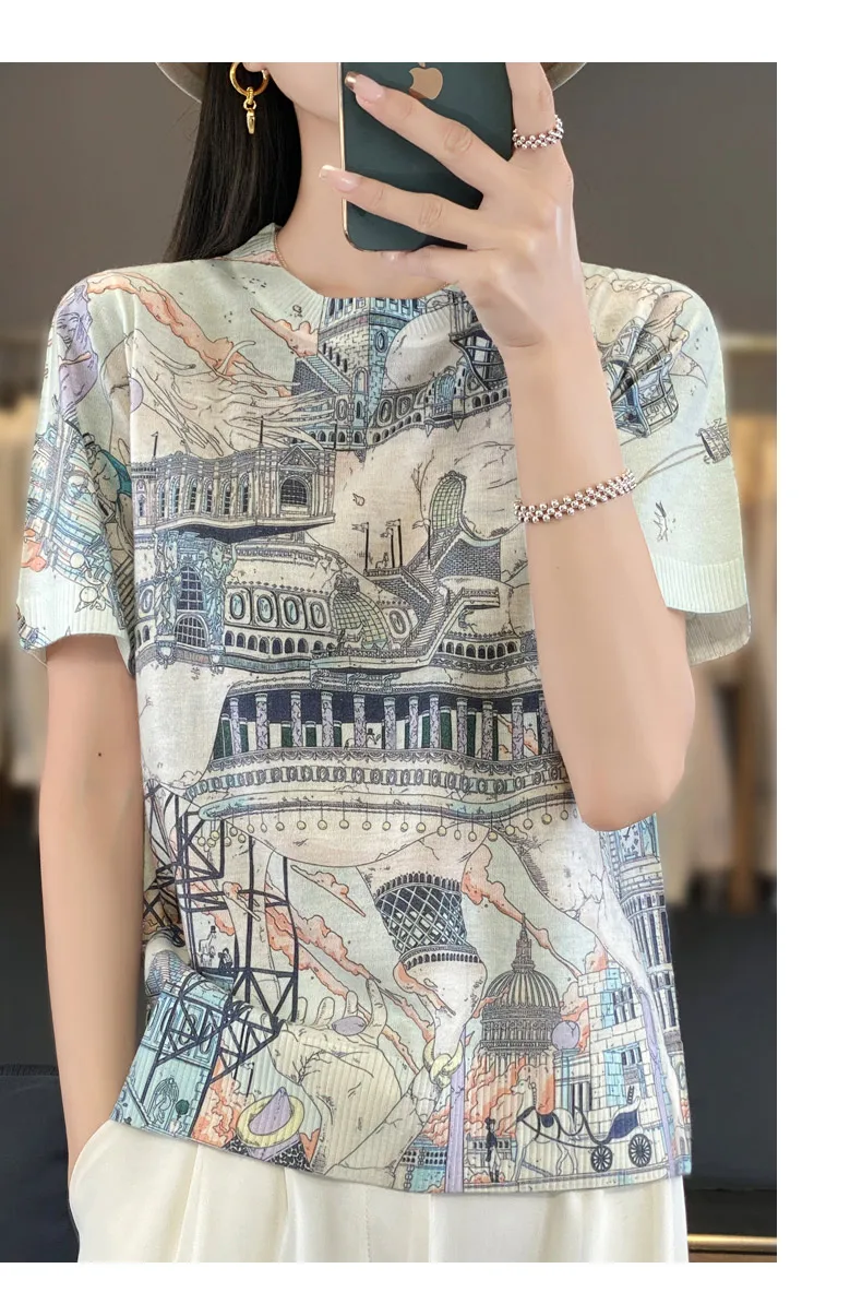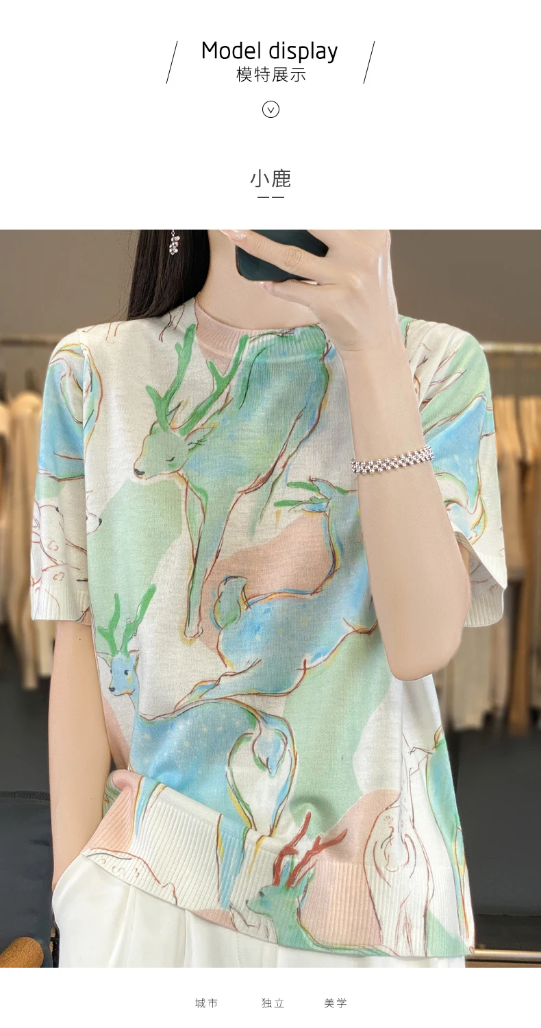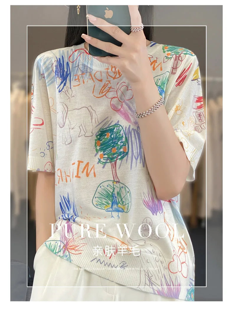 Thin Knitted Short-Sleeved Mulberry Silk T-Shirt In Summer With Women’s Wool Printed Half-Sleeve Loose Ice Silk Bottoming Shirt