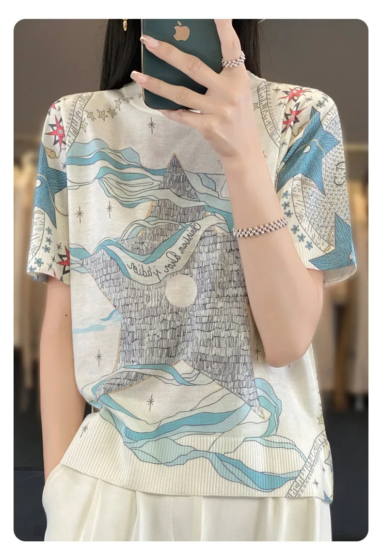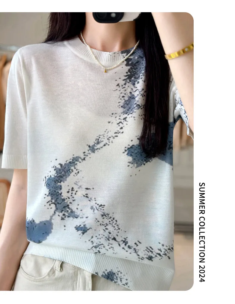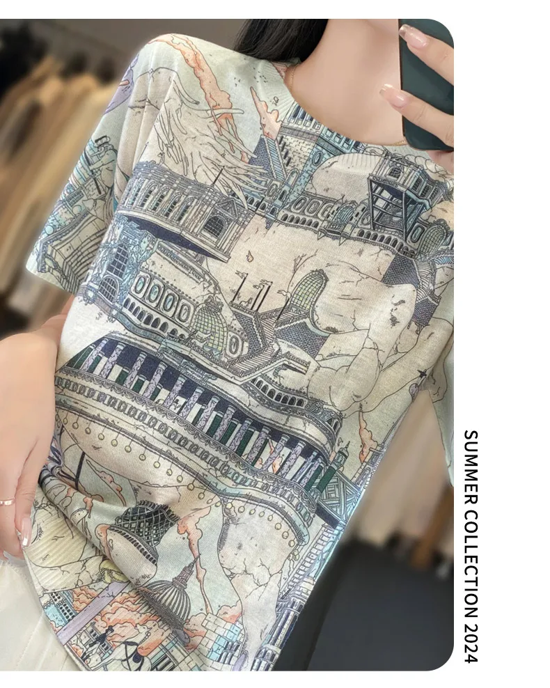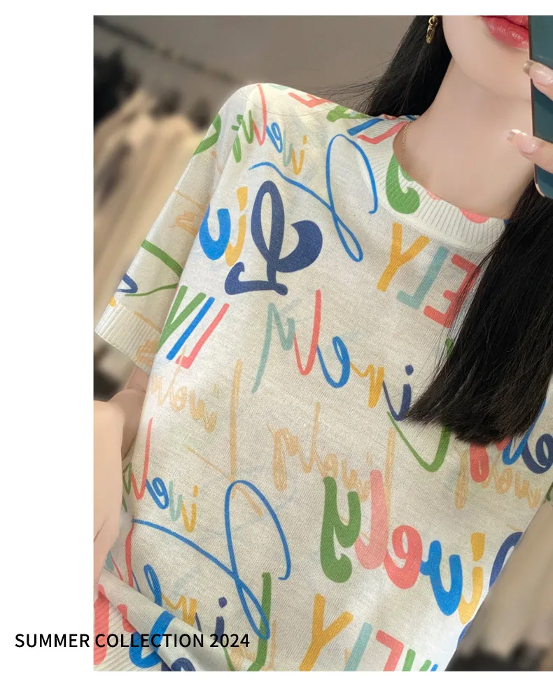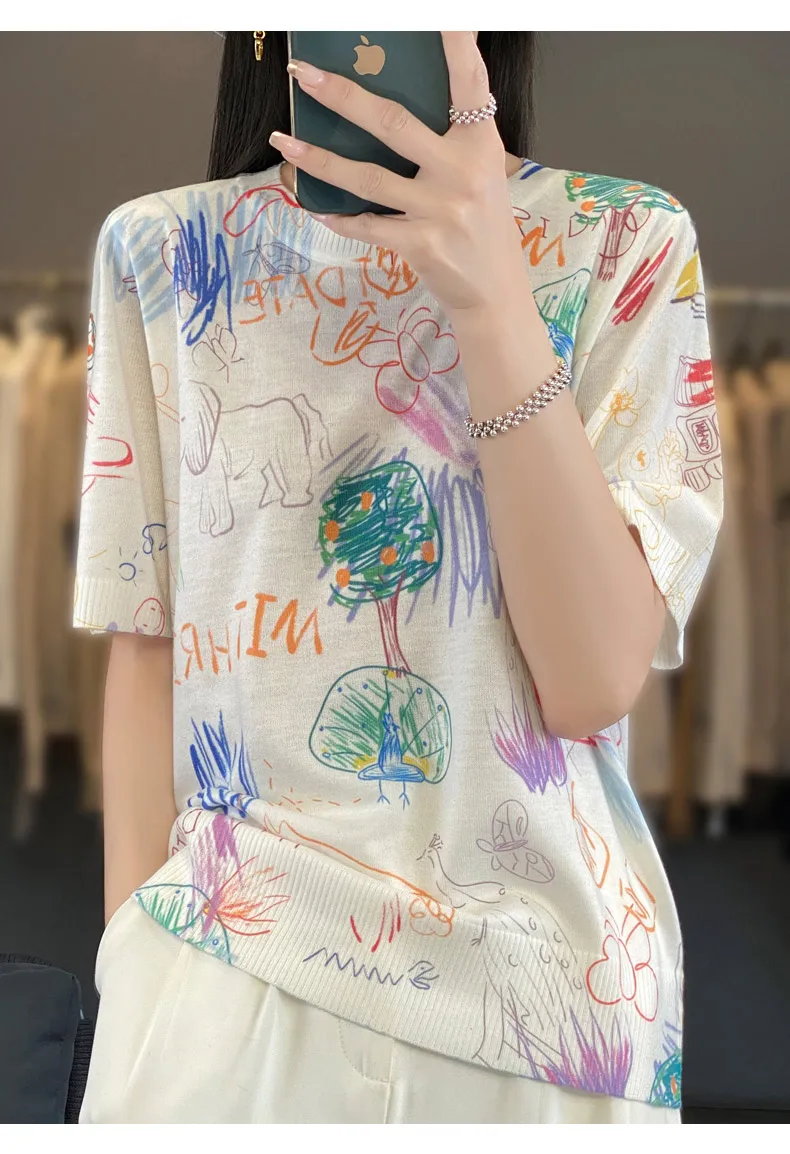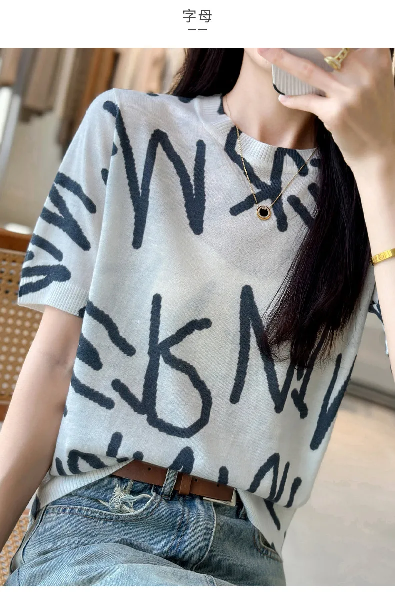 Thin Knitted Short-Sleeved Mulberry Silk T-Shirt In Summer With Women’s Wool Printed Half-Sleeve Loose Ice Silk Bottoming Shirt