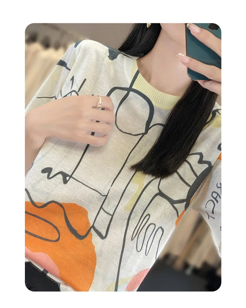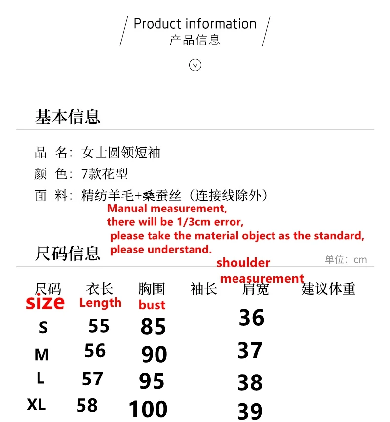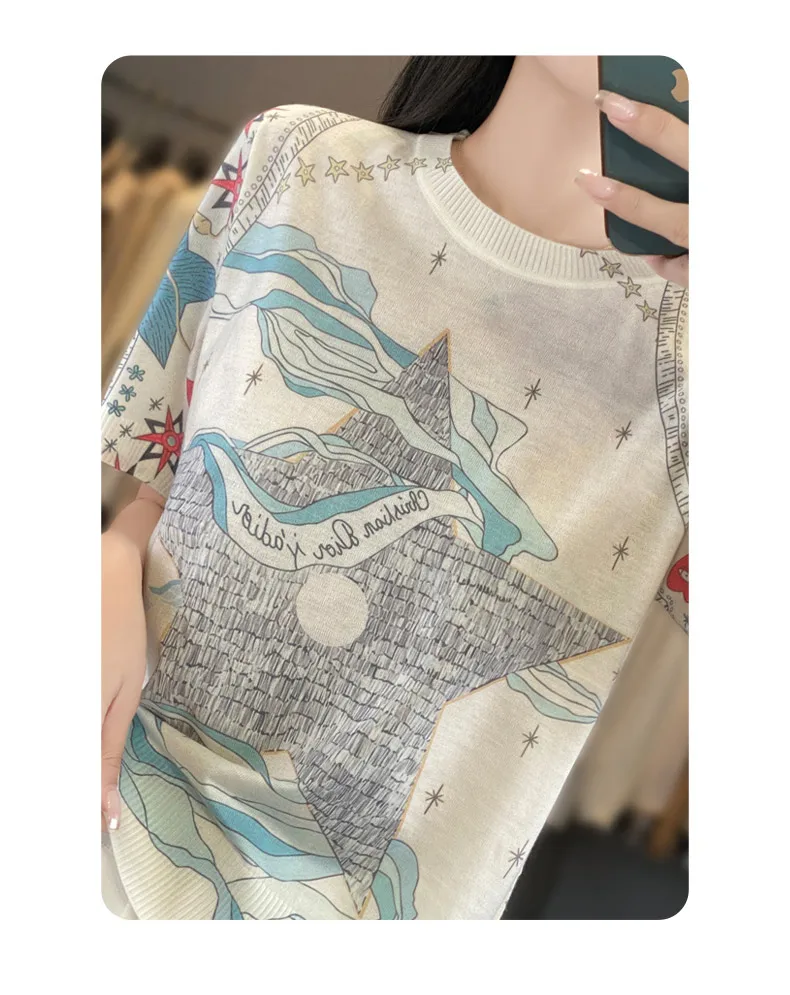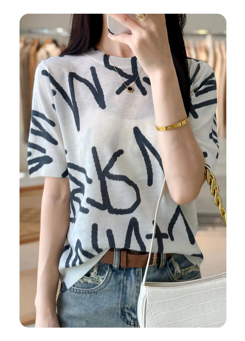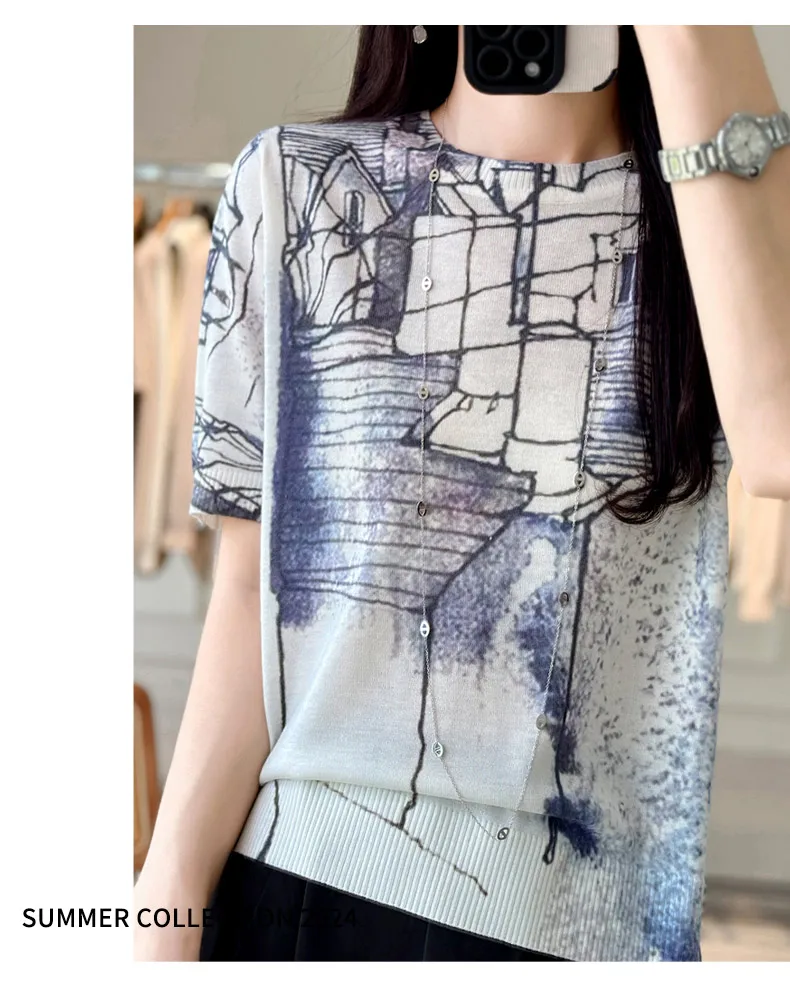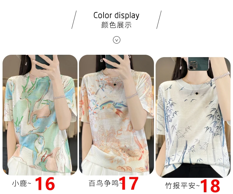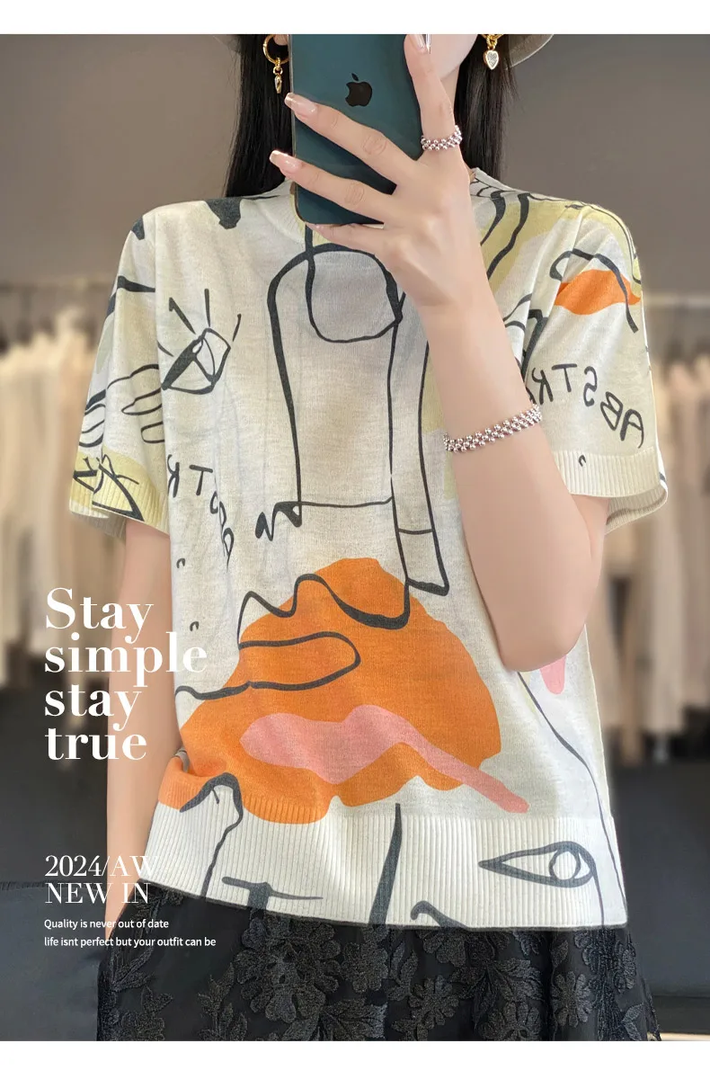 Thin Knitted Short-Sleeved Mulberry Silk T-Shirt In Summer With Women’s Wool Printed Half-Sleeve Loose Ice Silk Bottoming Shirt