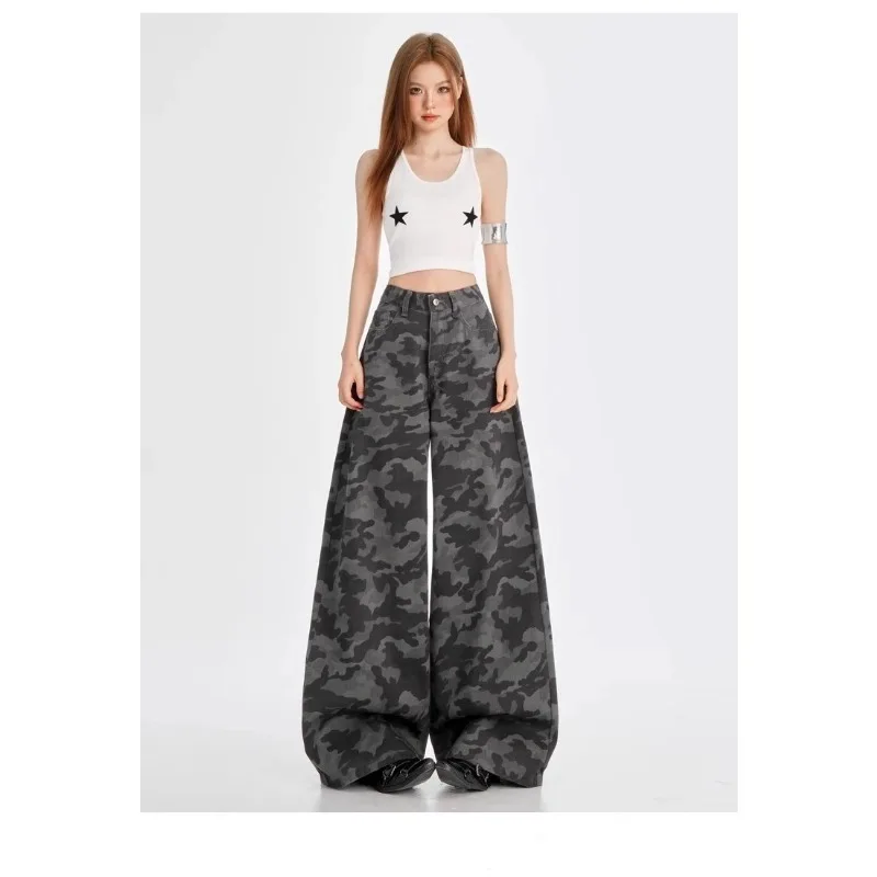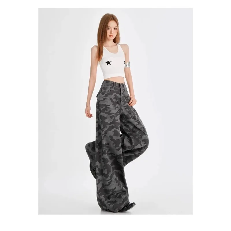 Vintage Camouflage Print Plus Size Wide Leg Pants Y2K Streetwear Fashion American Pants for Women High Waist All-match Trousers