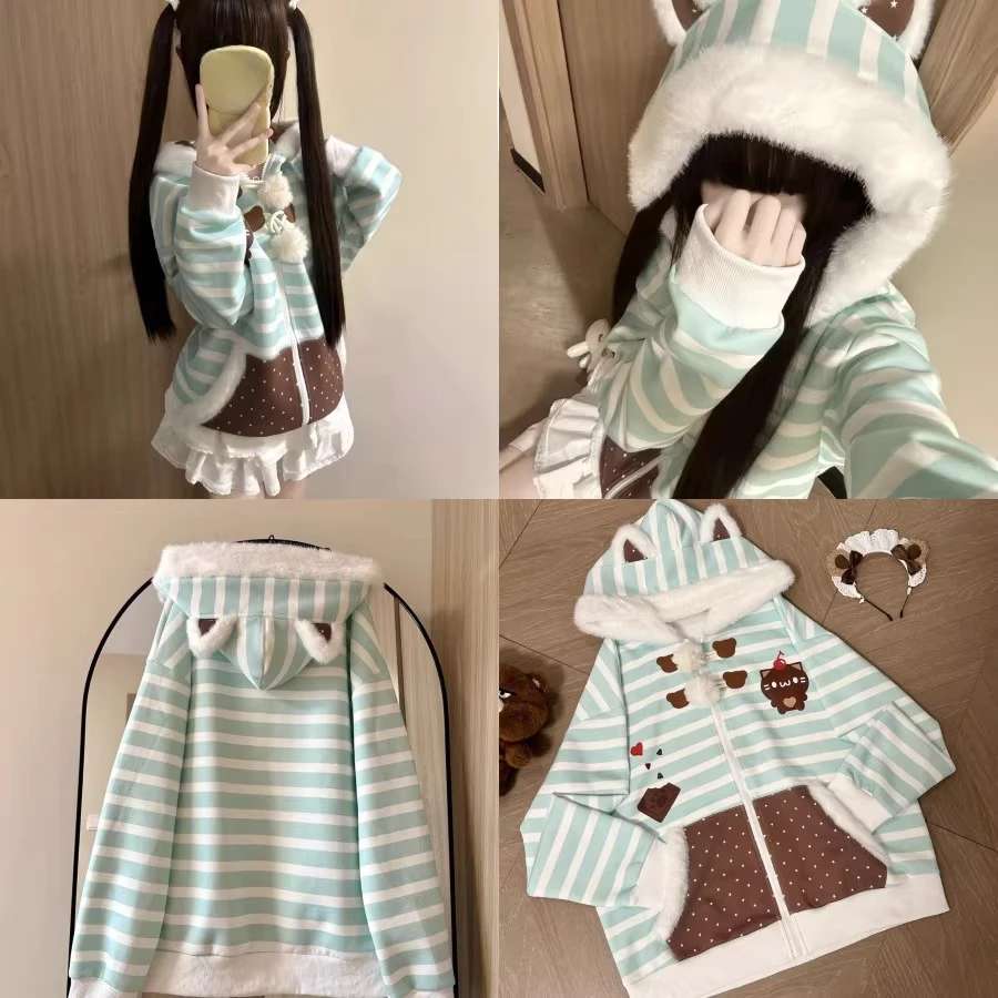 Vintage Kawaii Long Sleeve Loose Coat with Hooded Women Japanese Cute Zipper Sweatshirts Female Casual Y2k Jacket Overcoat Chic