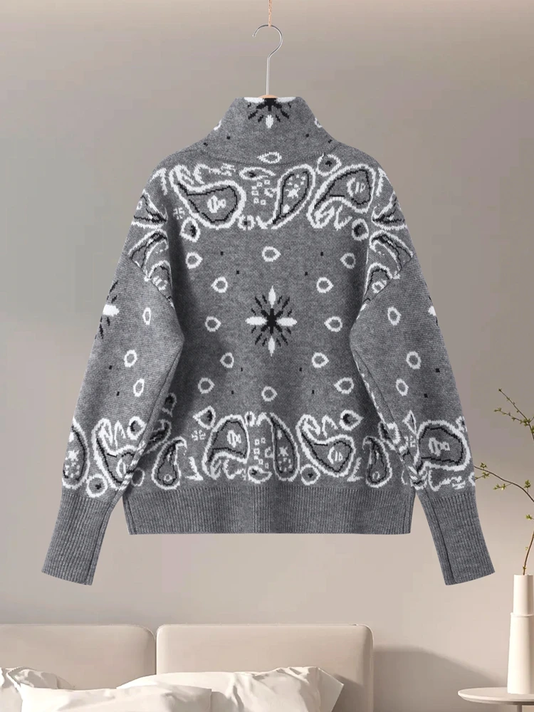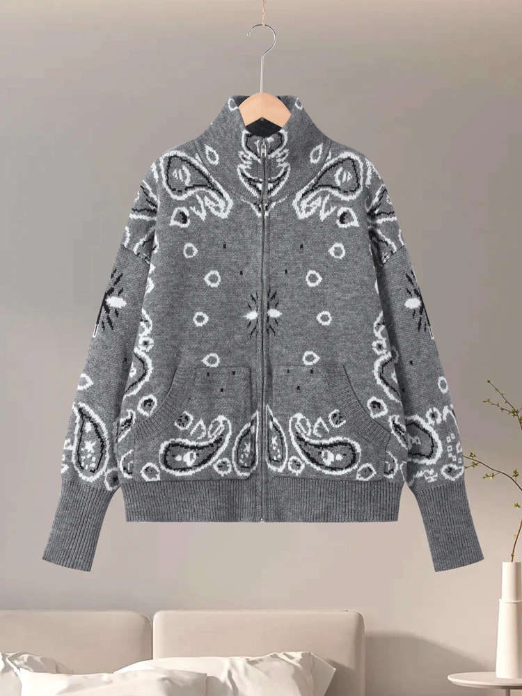 Vintage Knit Jacquard Stand Collar Women Cardigan Zipper Full Sleeve Pockets Loose Sweater New 2026 Spring Lady Soft Knitwear