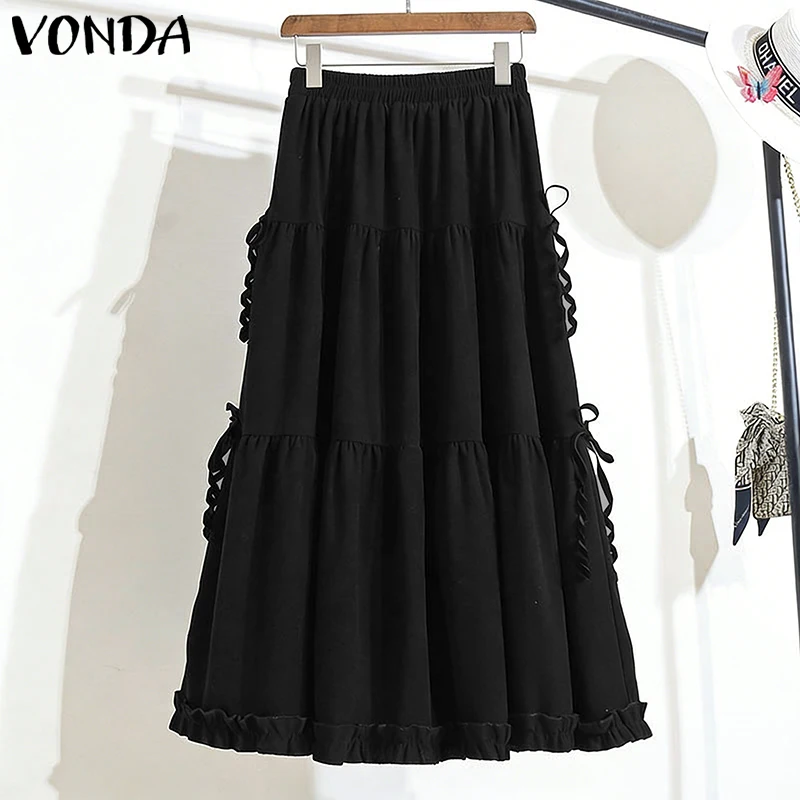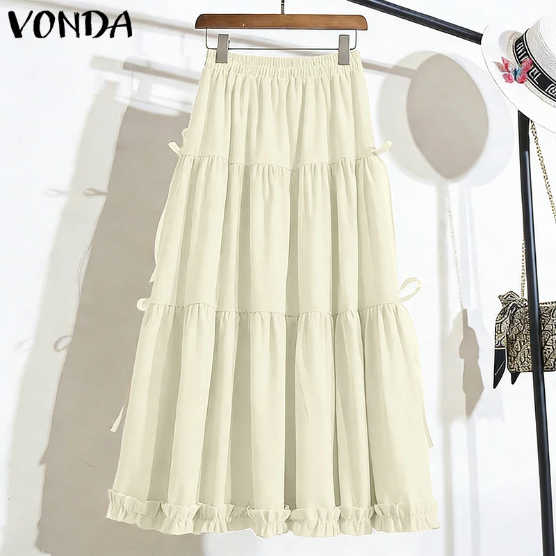 VONDA Plus Size 5XL Women Elegant Bow Maxi Skirts Fashion High Waist Pleated Ruffled Long Skirts Elastic Waist Jupes Faldas Saia