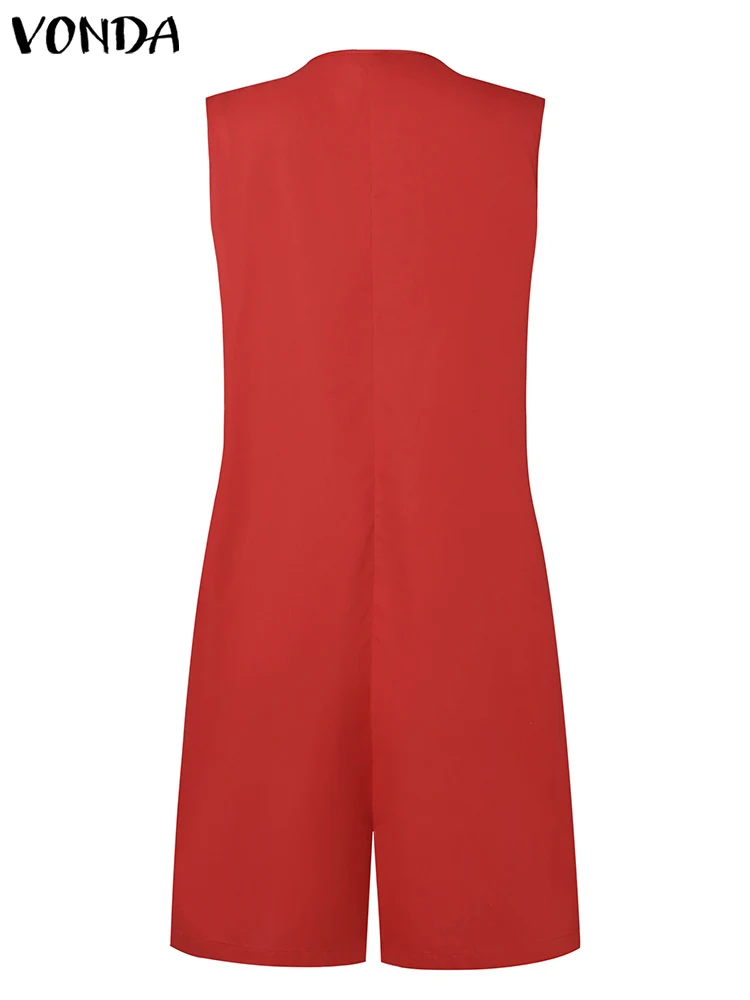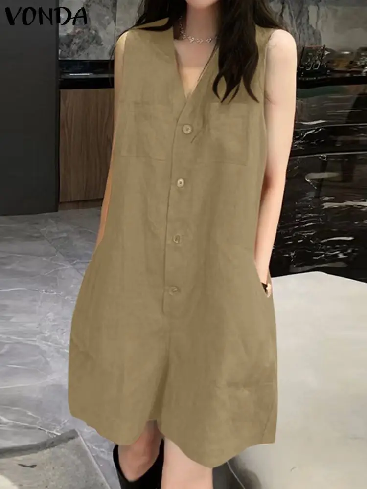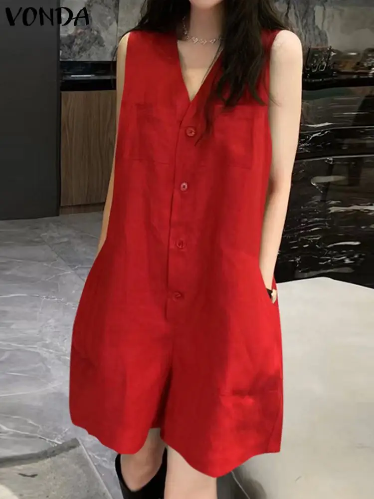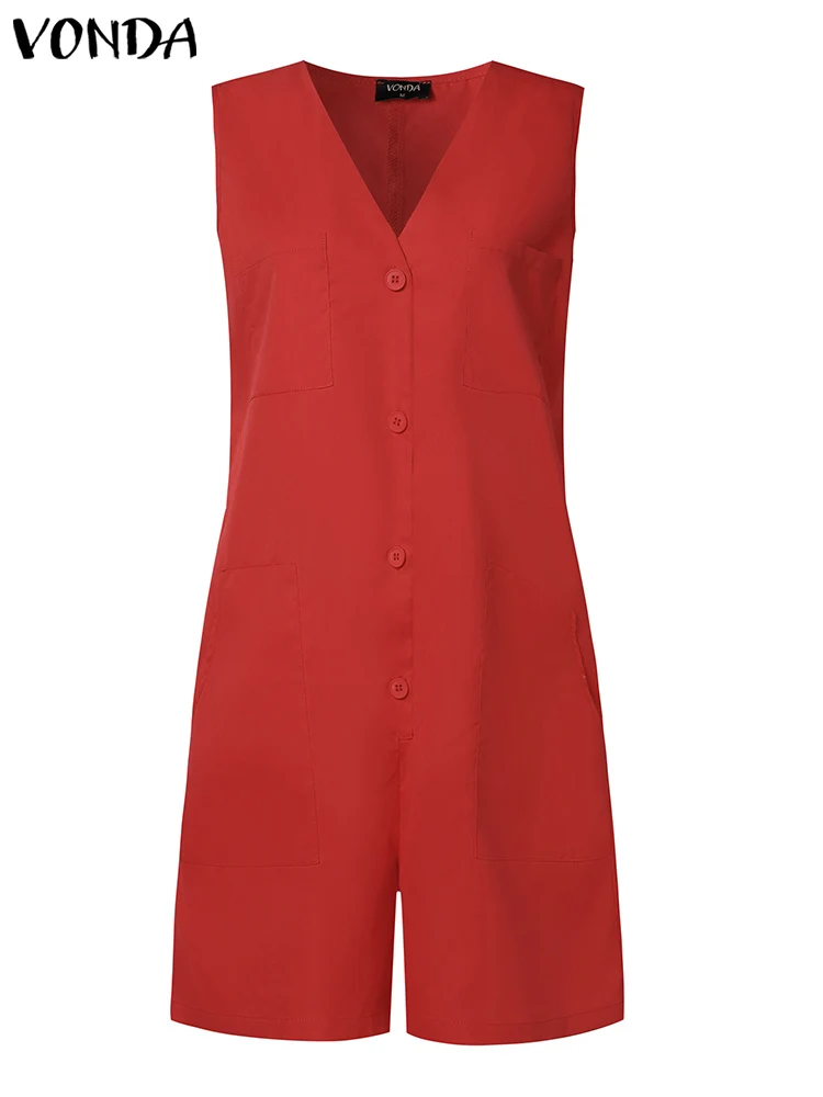 VONDA Women Short Jumpsuits Summer Sexy Sleeveless Rompers Casual Loose Fashion V Neck Pockets Solid Playsuits Party Overalls