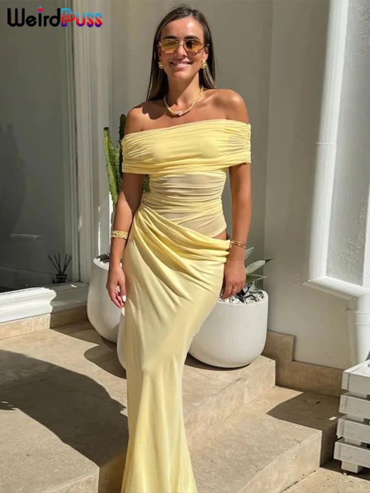 Weird Puss Ruched Irregular Dress Women Mesh Patchwork Slash Neck Short Sleeve Skinny Stretch Trend Elegant Long Bodycon Outfits