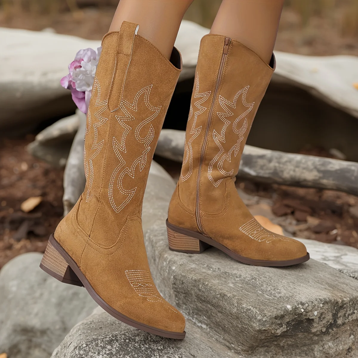 Western Cowboy Boots for Women – Knee High Wide Calf Cowgirl Boots with Classic Embroidered, Suede denim boots,Slip On Pointed T