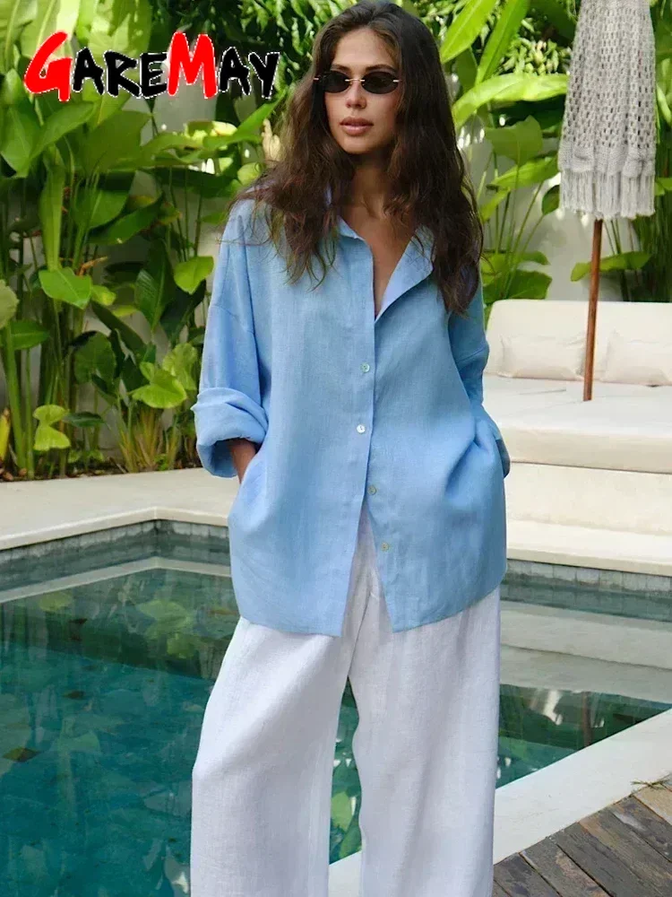 White Women’s Linen Shirt Long Sleeve Elegant Pink Oversize Blouse Vintage Spring Basic Top Collar Cotton Linen Shirt for Women