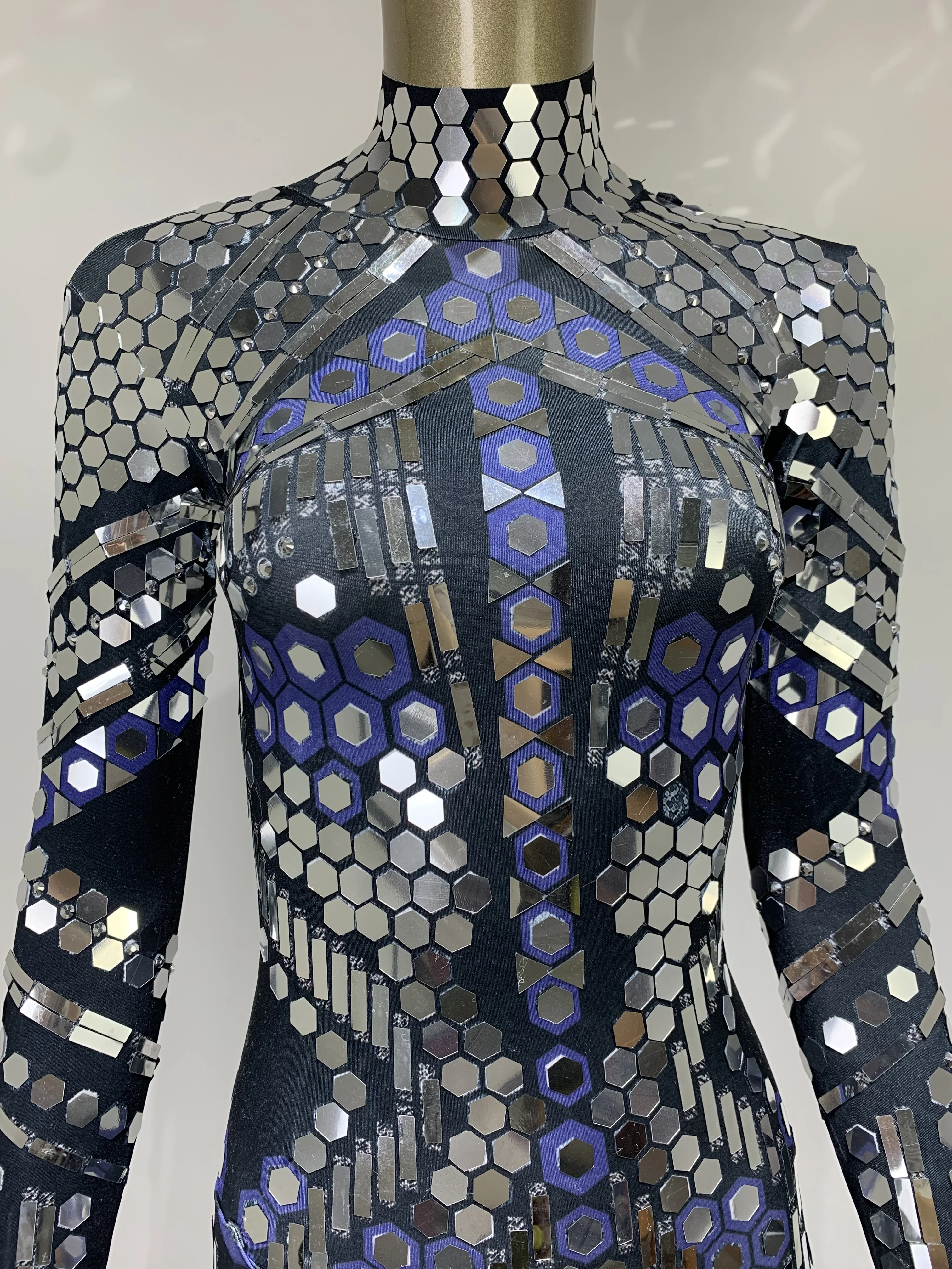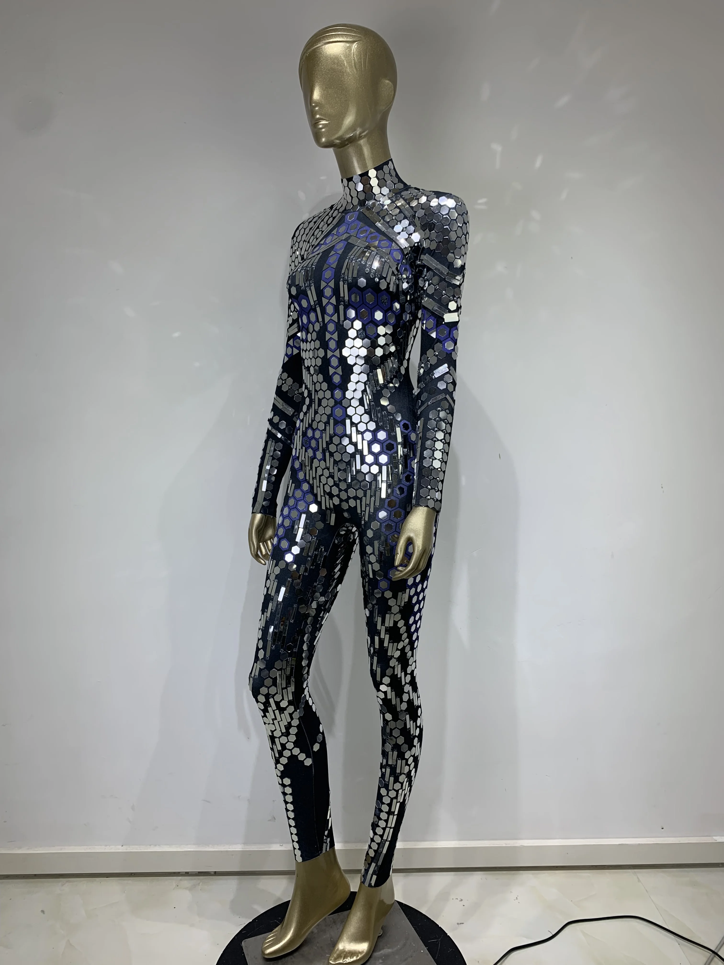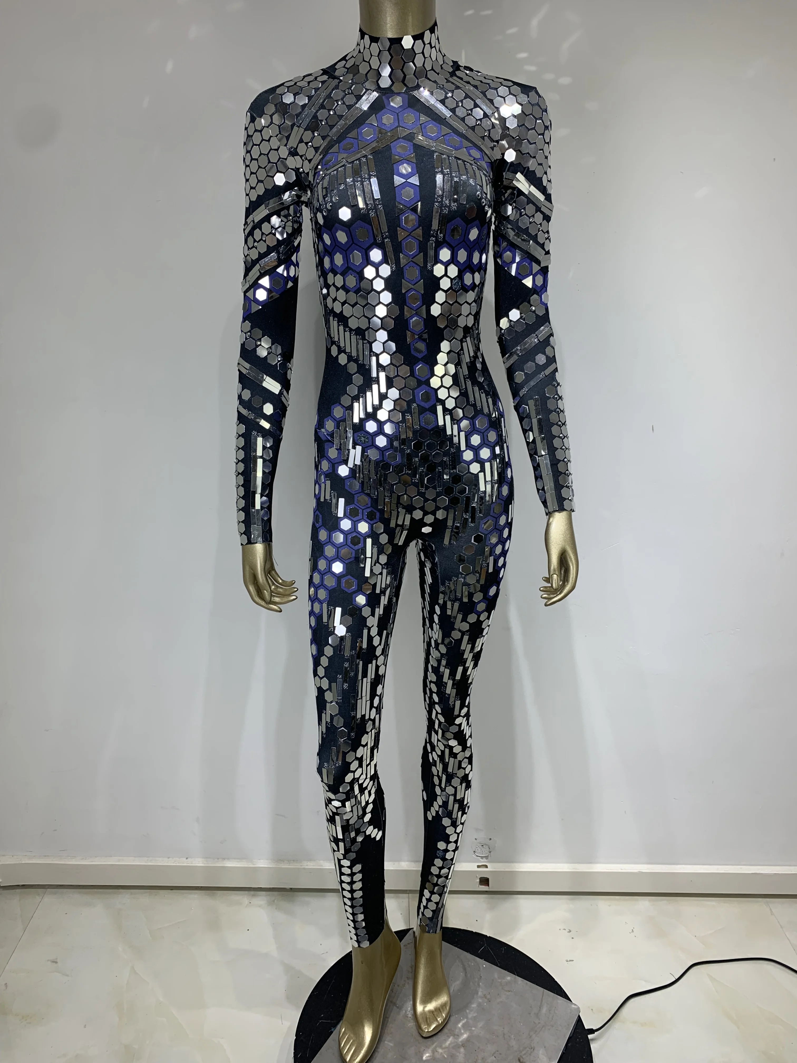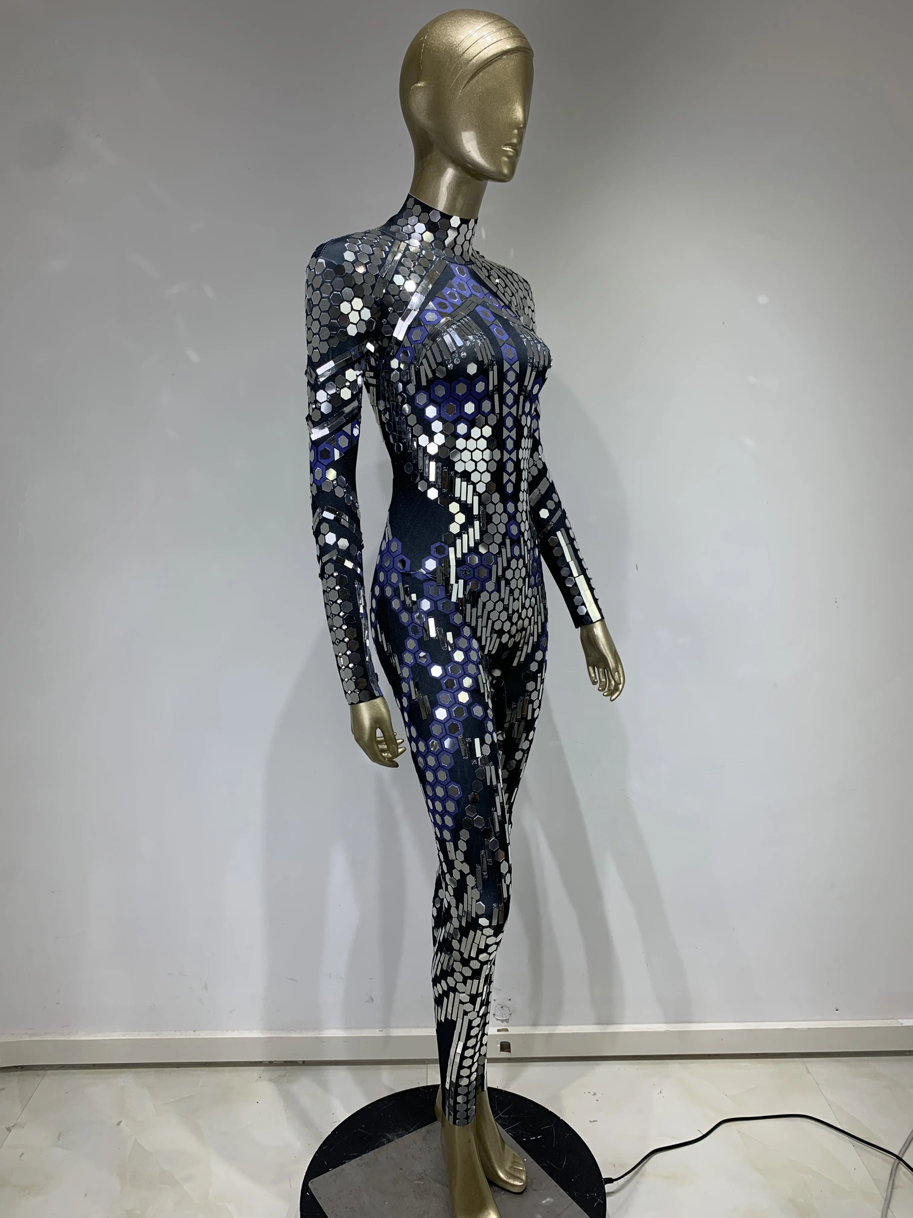 Women Black Geometric Sequins Long Sleeved Stretch Tight Jumpsuit Y2K Bar Nightclub DJ Female Singer Stage Performance Clothing