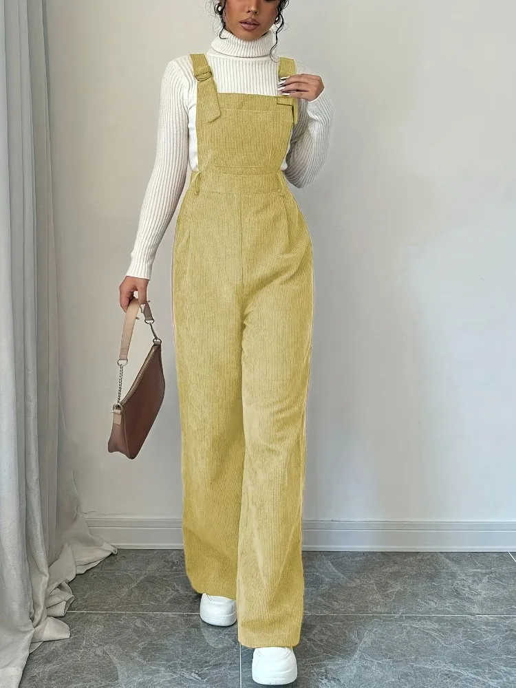 Women Casual Jumpsuit Corduroy Wide Shoulder Straps Button Detail Solid Color Relaxed Fit Autumn Winter Hand Wash Only