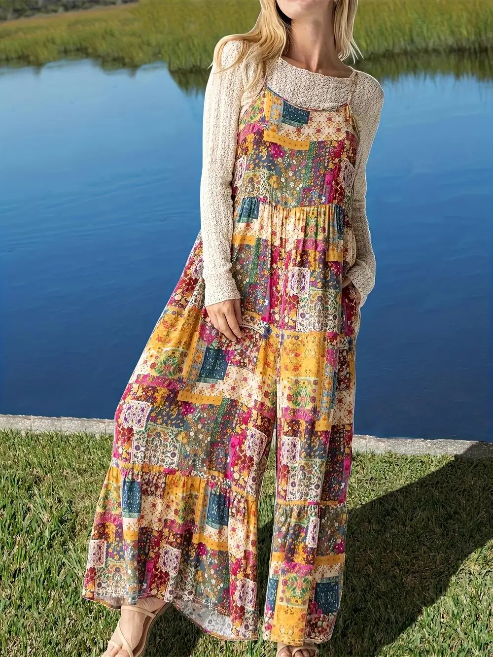 Women Casual Jumpsuits Fashion Overalls Female Loose Wide Leg Printed Button with Pockets