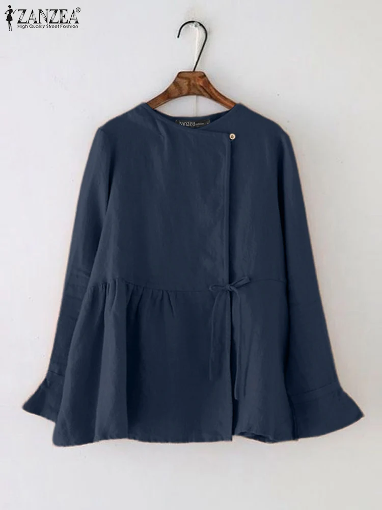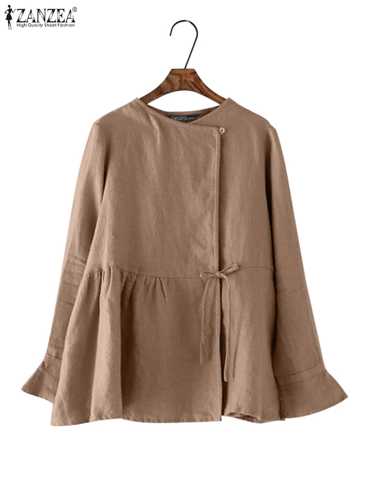 Women Casual Open-front Lace-up Shirts ZANZEA Long Sleeve O Neck Solid Cotton Blouses 2025 Spring Loose Tunic Tops with Pleats