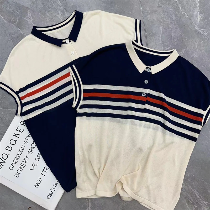 Women Clothing Summer Trendy Striped Polo Collar Ice Silk Knitted T-shirt Elegant Simple Casual Short Sleeve Loose Pullover Tops