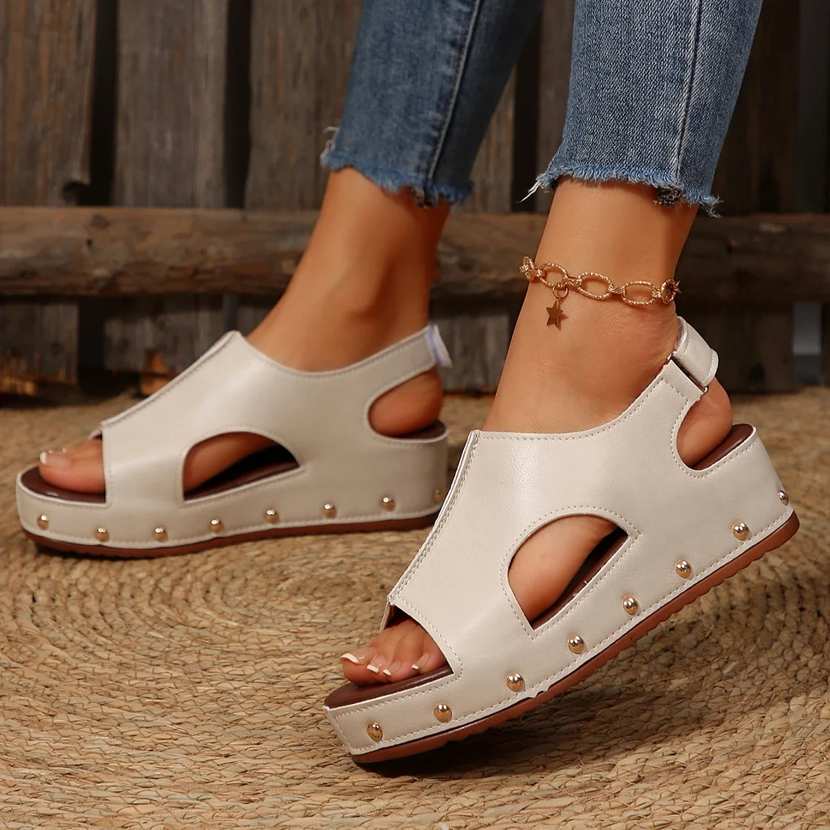 Women Comfort Wedges Sandals Peep Toe Med Heel Platform Sandalias Mujer 2025 Rivet Thick Sole PU Leather Summer Shoes for Women