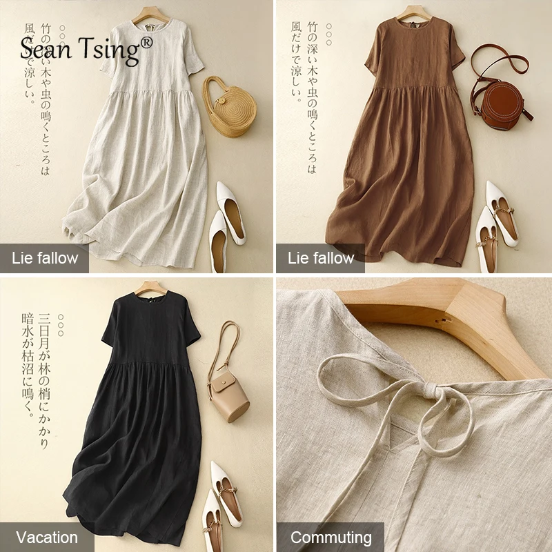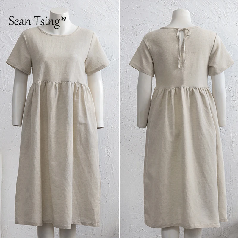 Women Cotton Linen Midi Dresses Summer Chic Female Vestidos Loose Soild A-Line Boho Dress Short Puffy Sleeve Casual Sundress New
