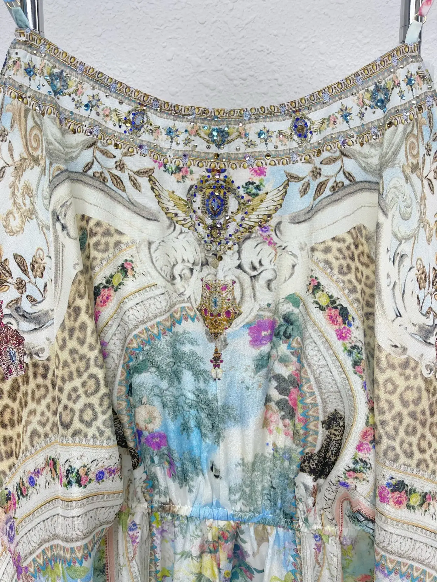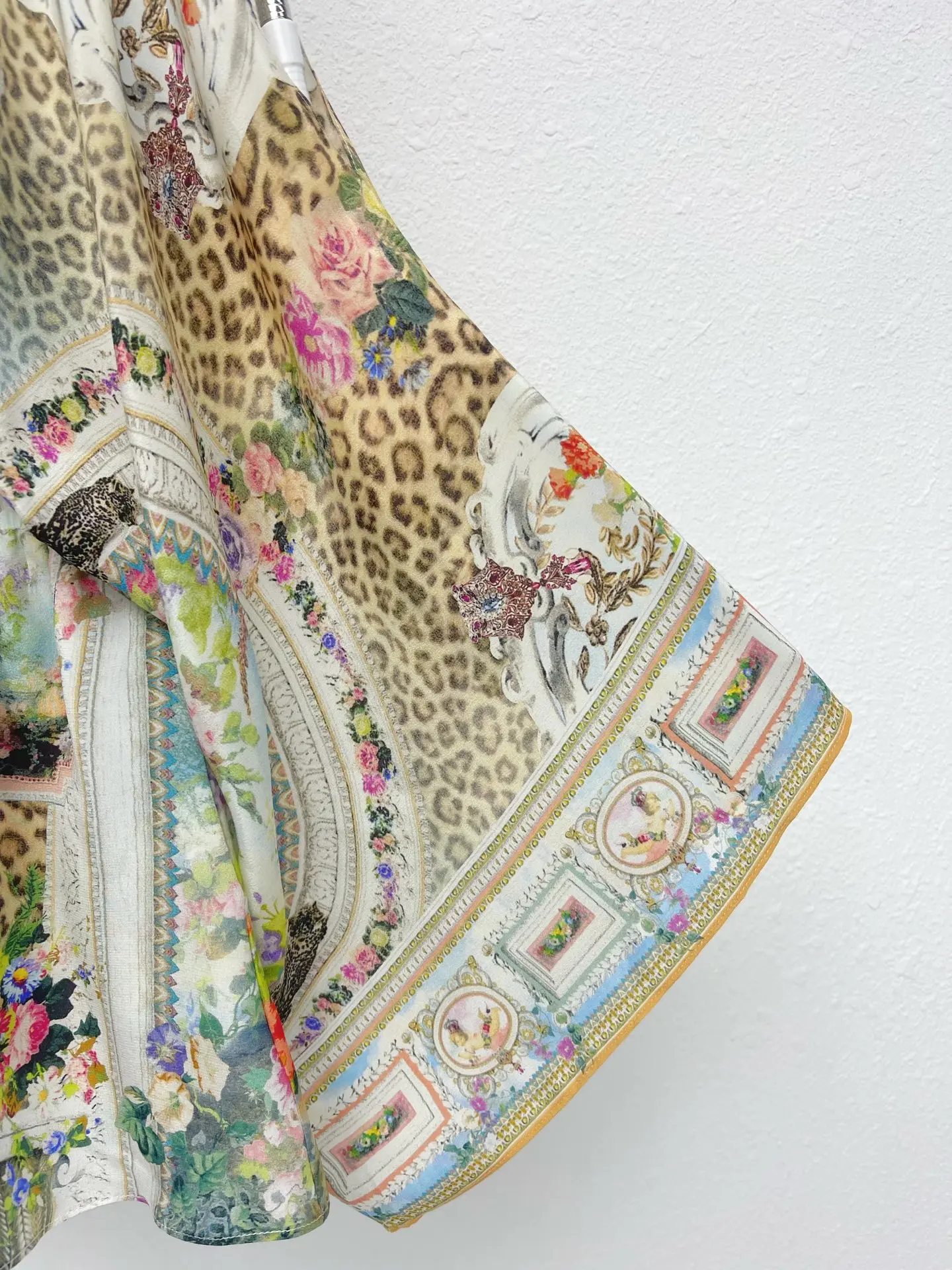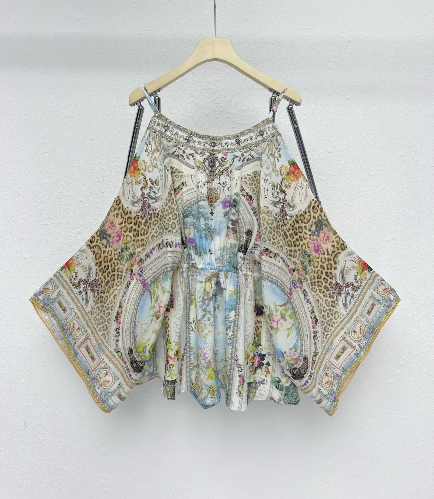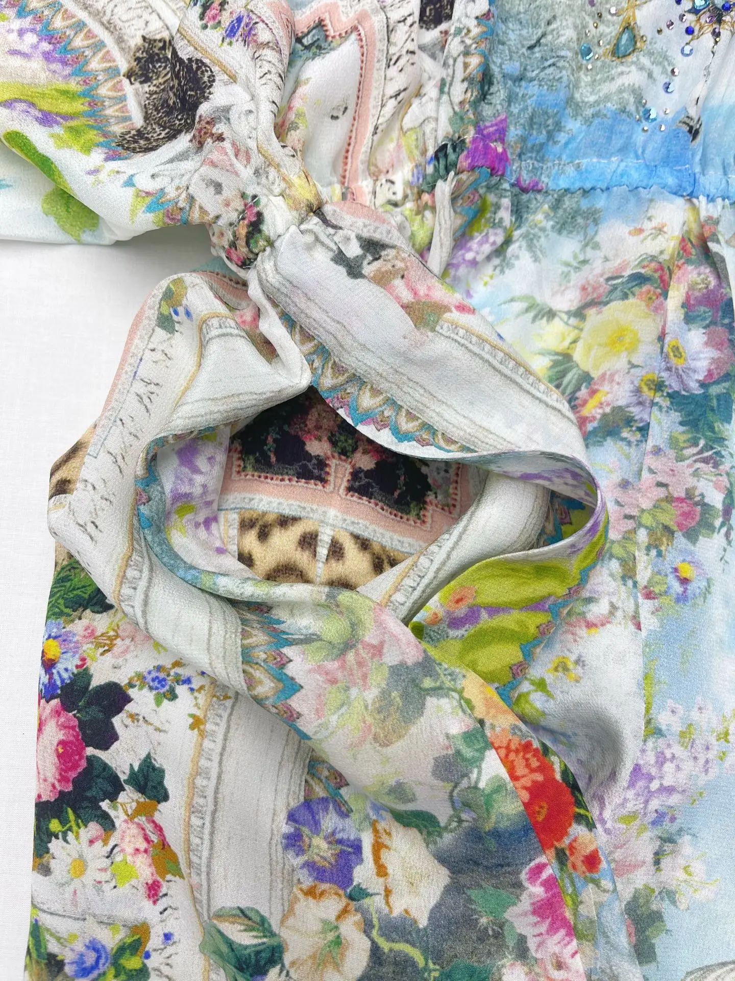 Women Crystal Beaded Jumpsuit Leopard Flower Print Off-Shoulder V-Neck High Waist Elegant Ladies 100% Silk Jumpsuit