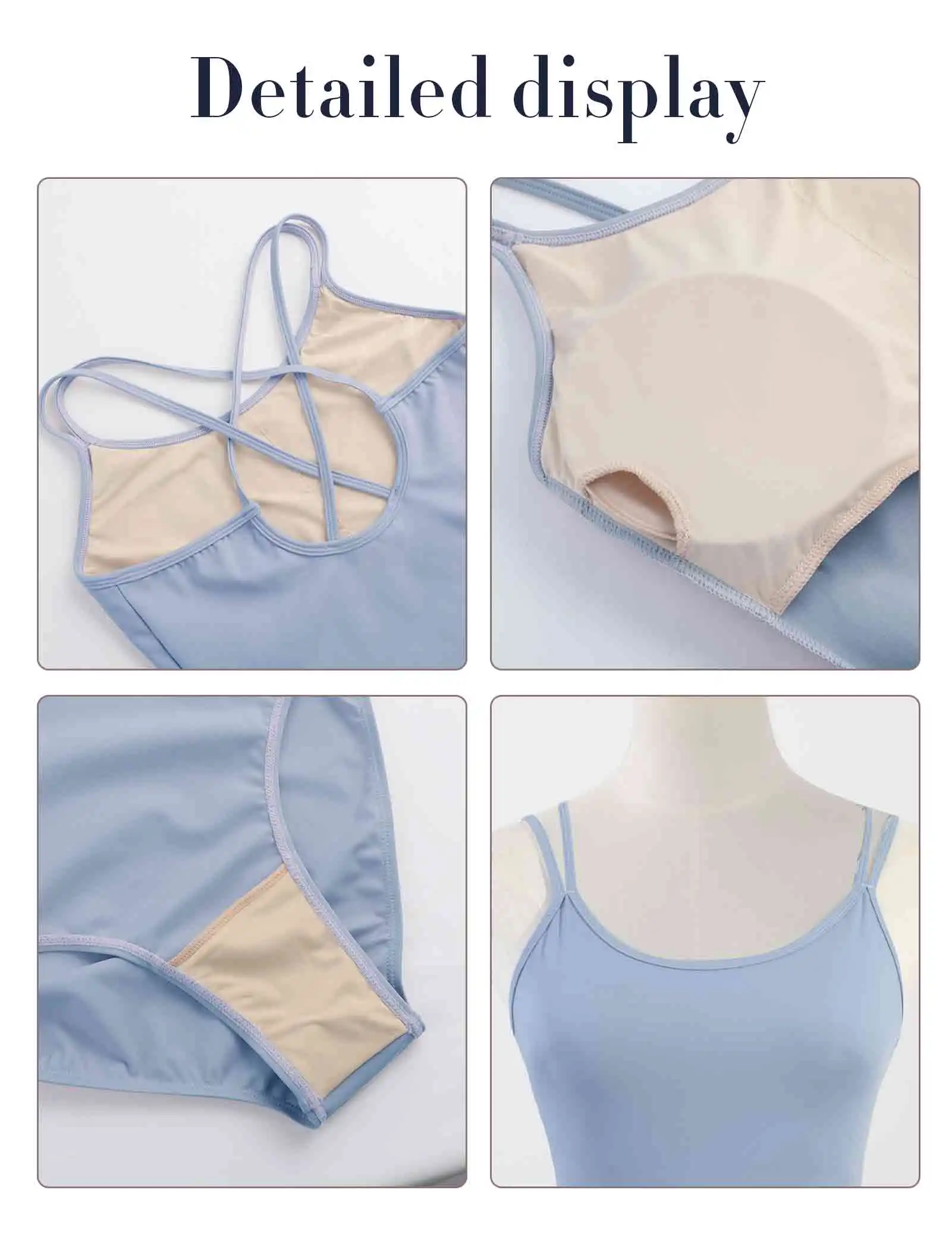 Design: Crew Neck,Insert Chest Pads,Double Camisole Back Crossover