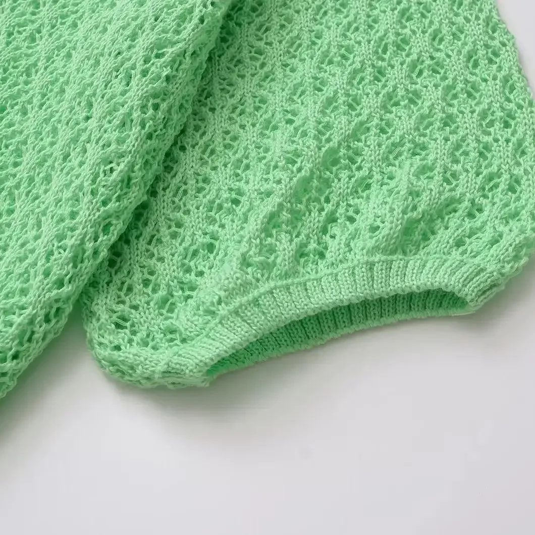 Women Fashion Jacquard Solid Knitted Hollow Out Pullover Sweater Vintage Lapel Neck Short Sleeve Female Chic Lady Tops