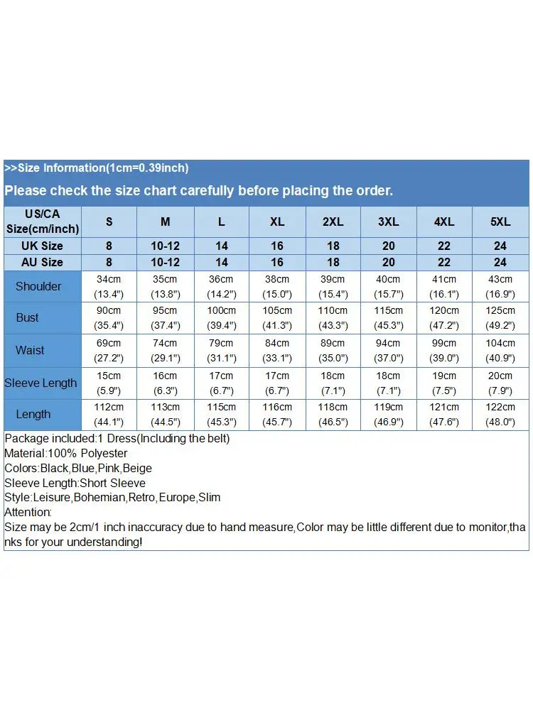 Material:100% Polyester Colors:Black,Blue,Pink,Beige Sleeve Length:Short Sleeve Neckline:V-Neck Pattern:Solid Color Length:Mid-Calf Length Buckle chain:With Back Zipper Thickness:Thin Style:Leisure,Bohemian,Retro,Europe,Slim Season:Spring,Summer,Autumn Occasion:Family,Party,Beach,Wedding,Holiday,Employment Label: Yes Attentions: 1.The Real Object May Exist Slightly Colors Differences Compared To Images As Different Computers Display.Caution If Minding,Thanks. 2.There Might Be A Manual Measuring 1-3 cm Error.Sorry For Any Inconvenience. 3.Please Prevail On Real Item, Model Images For Reference Only. 4.Attention!!!Please check the size chart carefully before placing the order. |