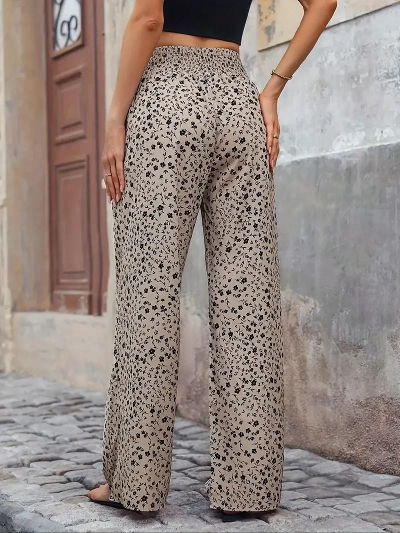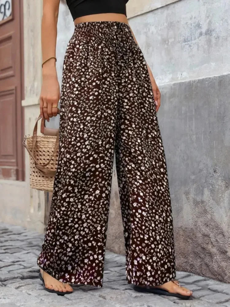 Women Fashion Plus Size 1XL-5XL Floral Print Wide Leg Pants Female Casual Elegant Drawstring High Waisted Loose Long Trousers