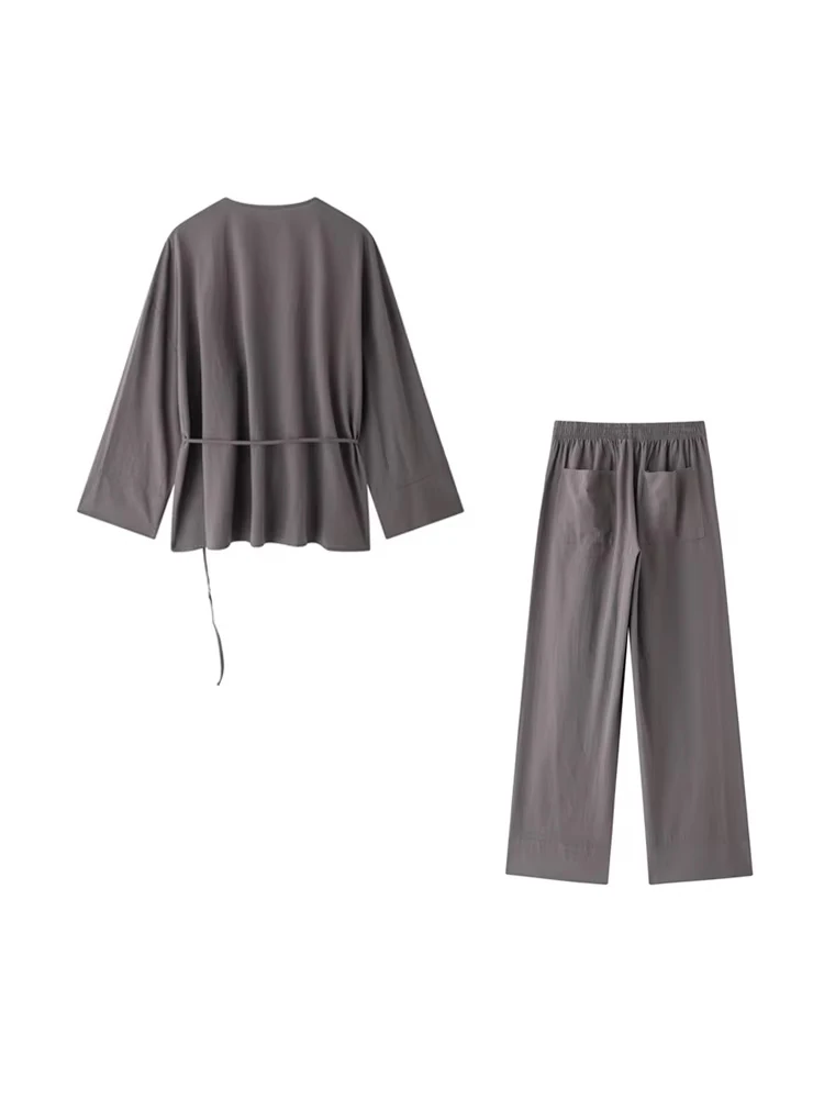 Women Fashion With Tied Loose Kimono Blouses And High Elastic Waist Side Pockets Pants Female Two Piece Sets Mujer