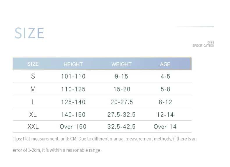 2XLheight 160-175cmL height 125-140cmM height 110-125cmS height 100-110cmXL height 140-160cm