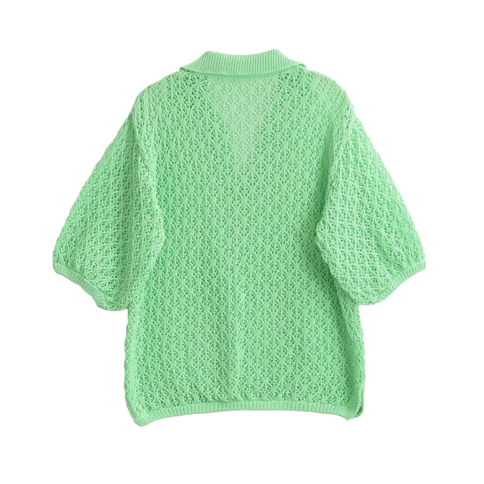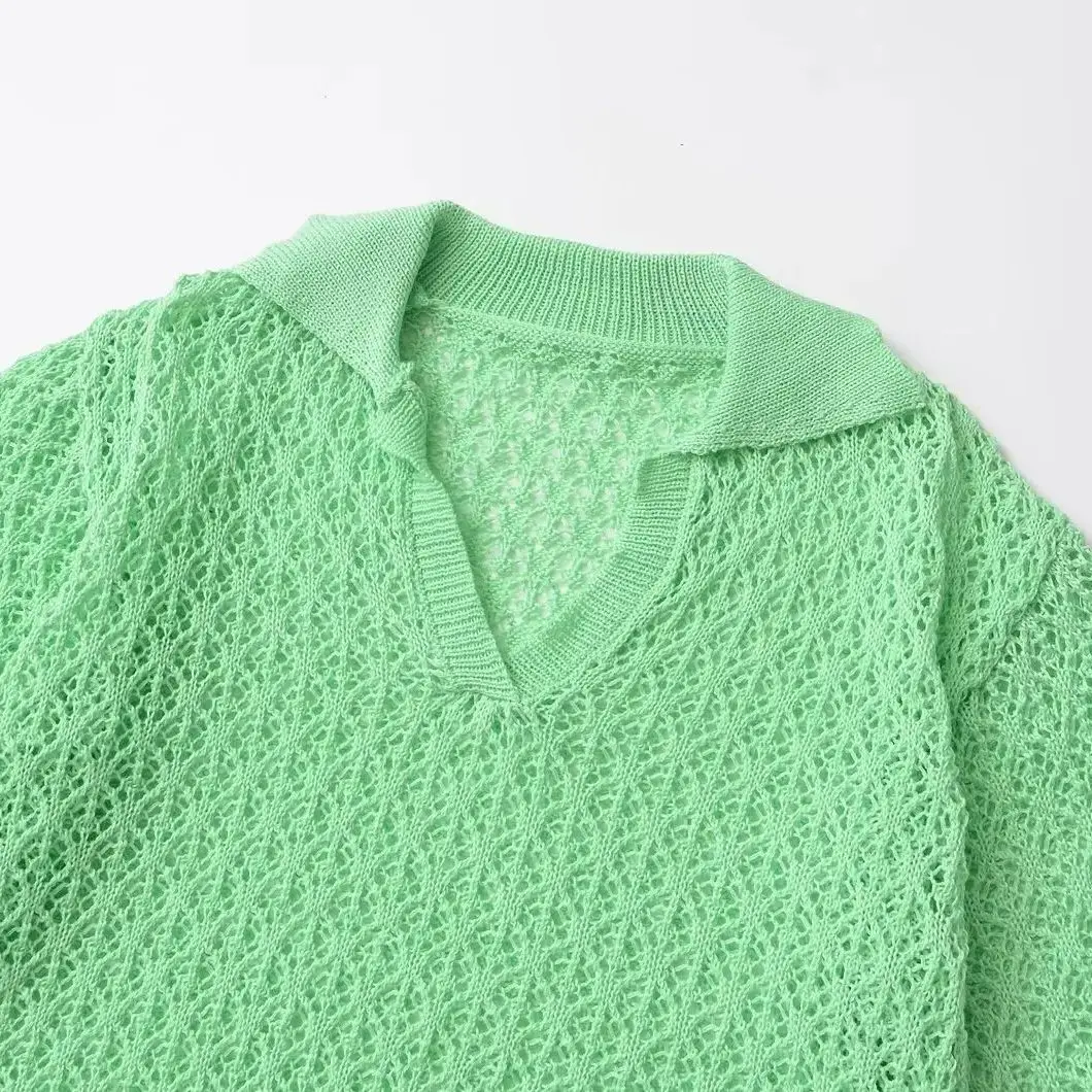 Women Jacquard Solid Knitted Hollow Out Pullover Sweater Vintage Lapel Neck Short Sleeve Female Chic Lady Tops