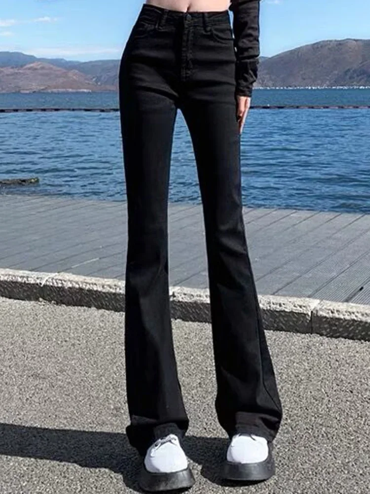 Women Korean Flare Jeans Girls High Waist Elastic Boot Cut Pants Lady Vintage Blue Black Gray Brown Denim Bell Bottom Trousers