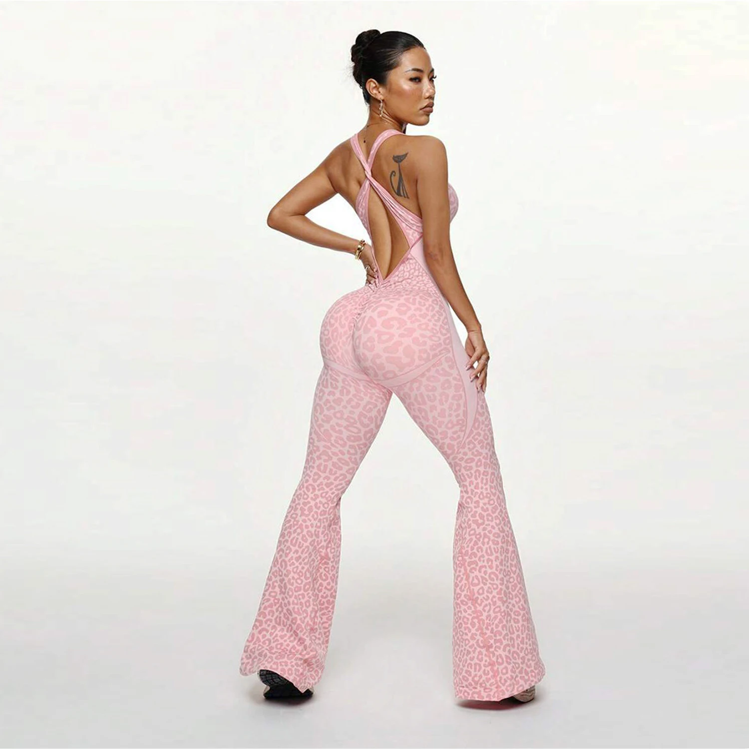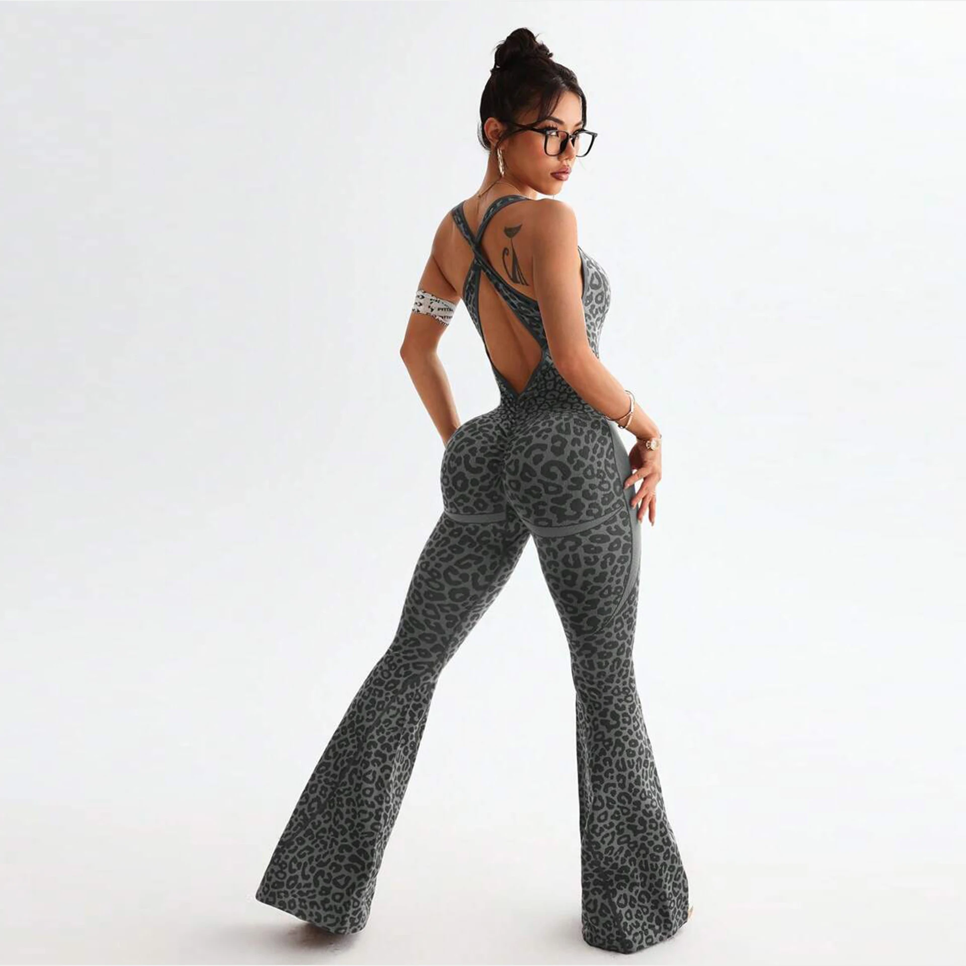 Women Leopard Sports Jumpsuits Flared Bodycon Tracksuits Crossover Bandage Yoga Workout Fitness Gym Training Athletic Tights