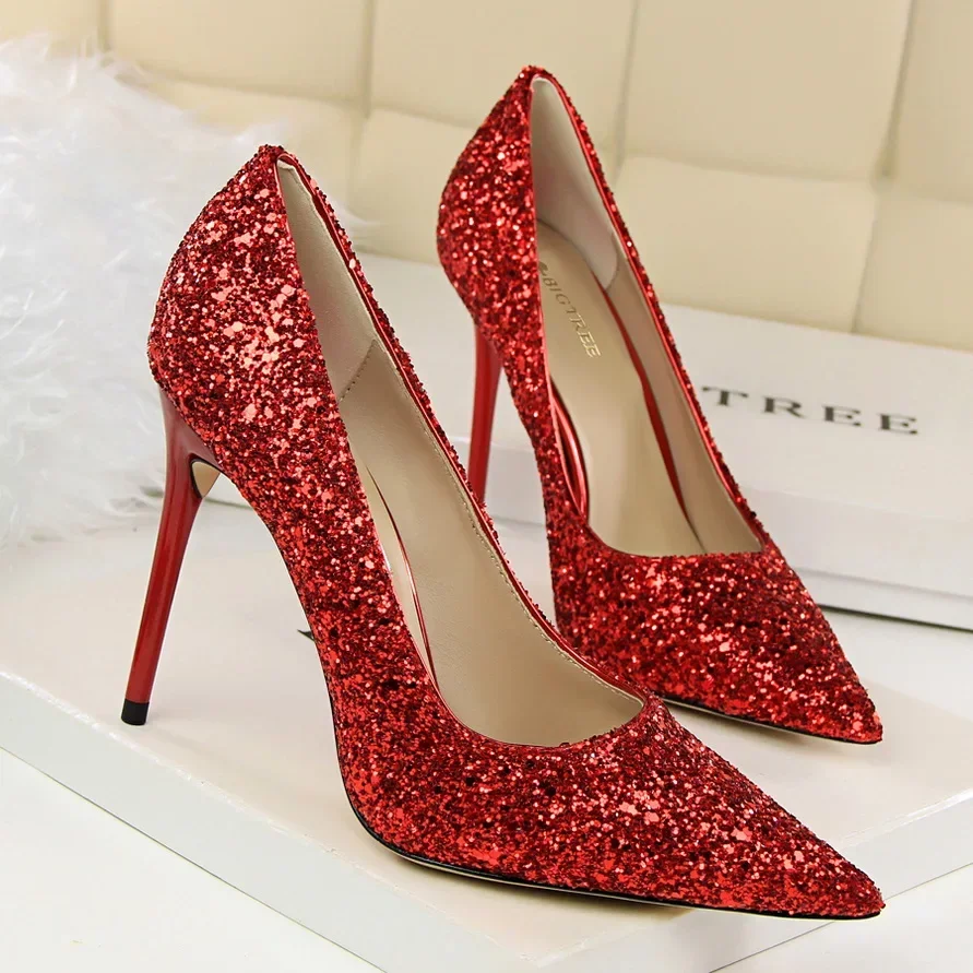 Women Luxury Bling Red Blue Valentine Party Scarpins Pumps Lady Glitter Sequins 7cm 9.5cm High Heels Designer Shoes Plus Size