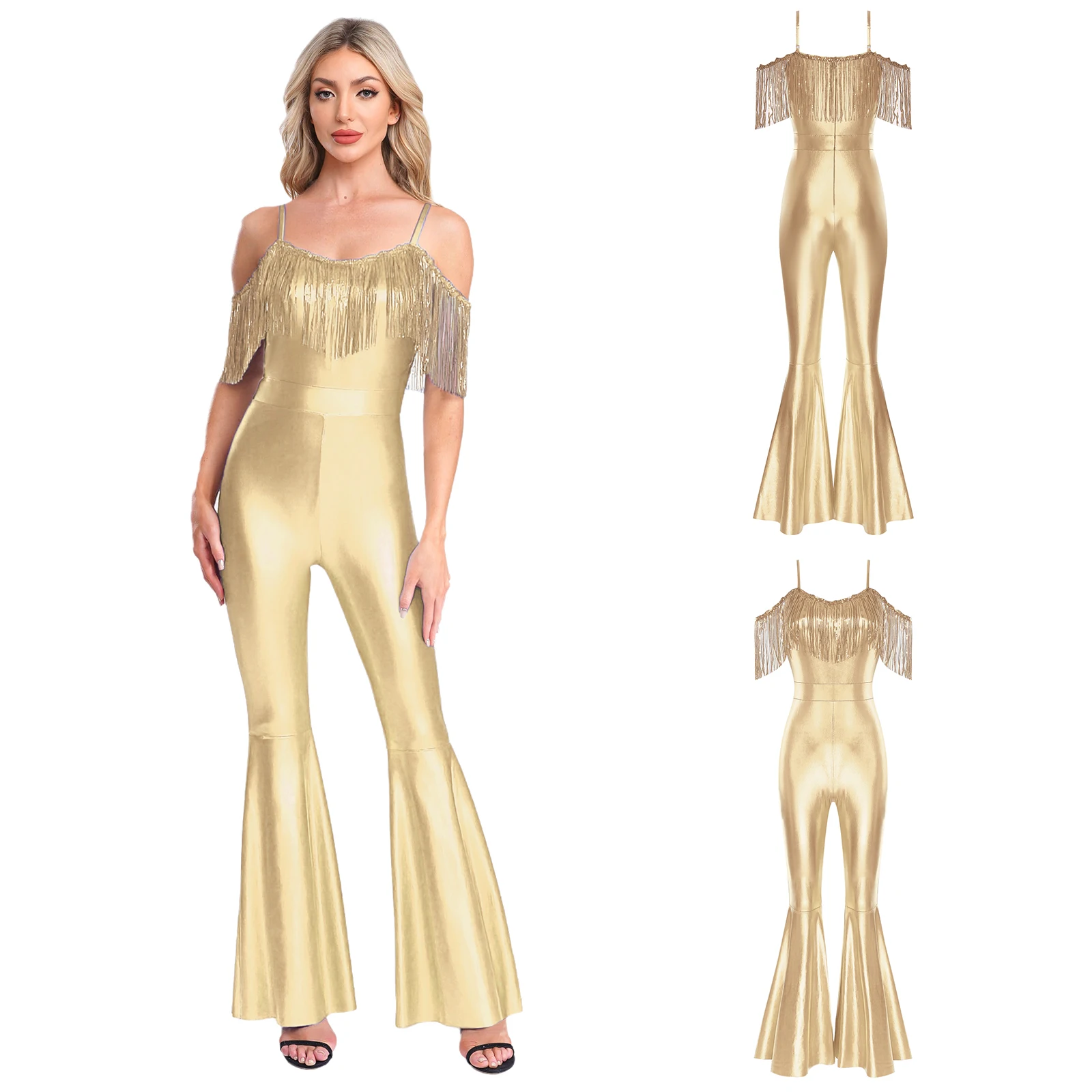 Women Metallic Shiny Dance Jumpsuit Sequin Tassel Sleeveless Bell Bottom Long Pants Bodysuit Romper for Jazz Music Festival