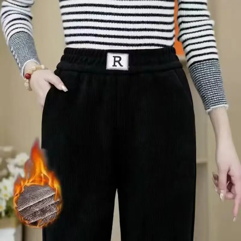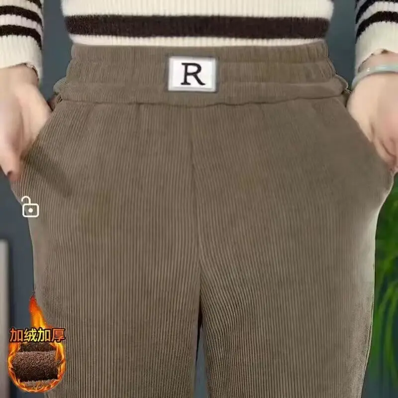 Women Plush Thick Straight Trousers Letter High Waist Corduroy Warm Trousers Loose Autumn Winter Thickened Windproof Harem Pants