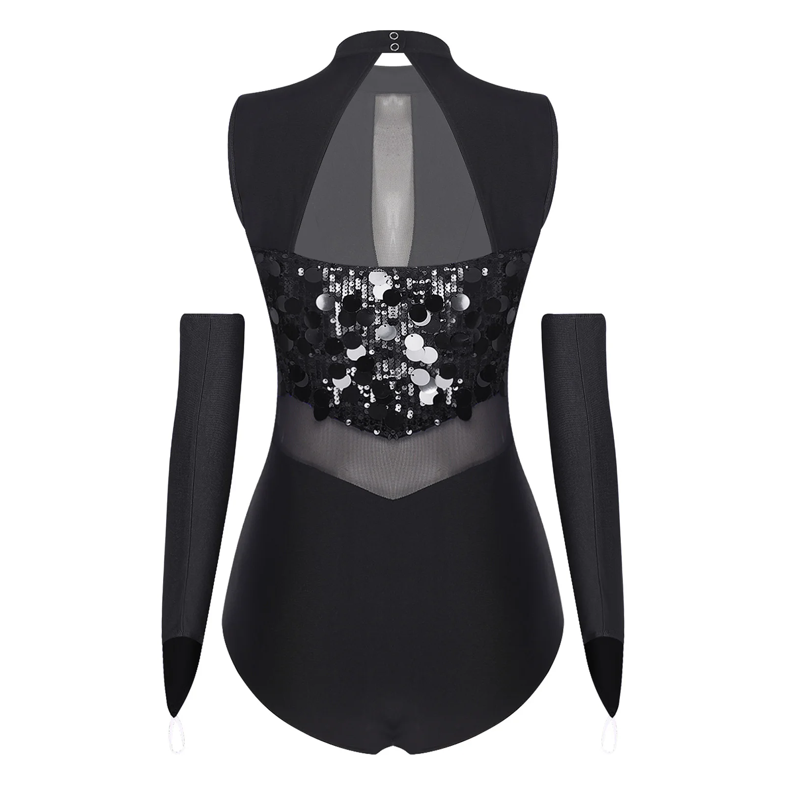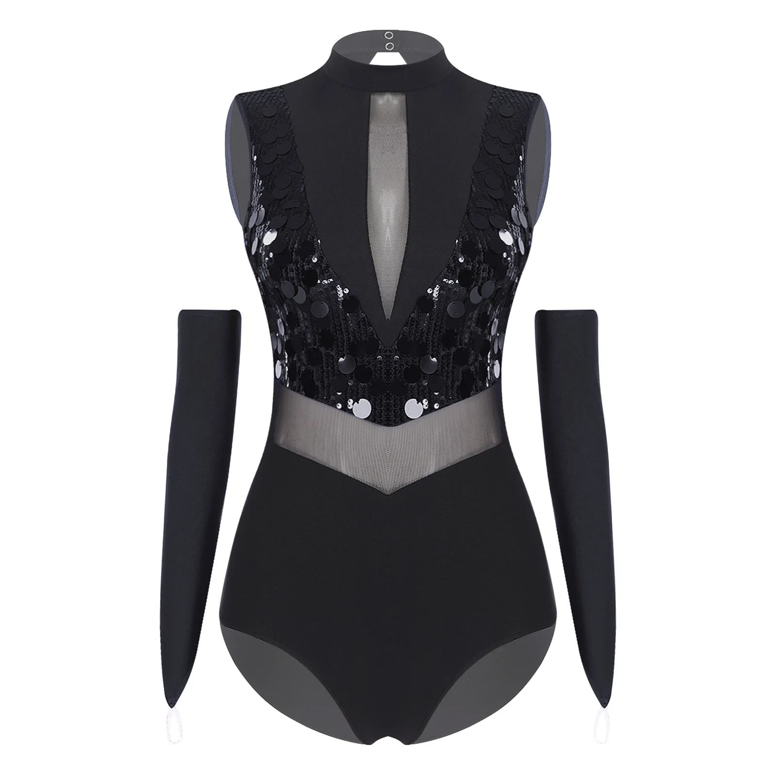 Women Sequin Dance Leotard Gymnastics Figure Skating Ballet Dance Performance Outfit Sheer Mesh Bodysuit with Gloves Dancewear
