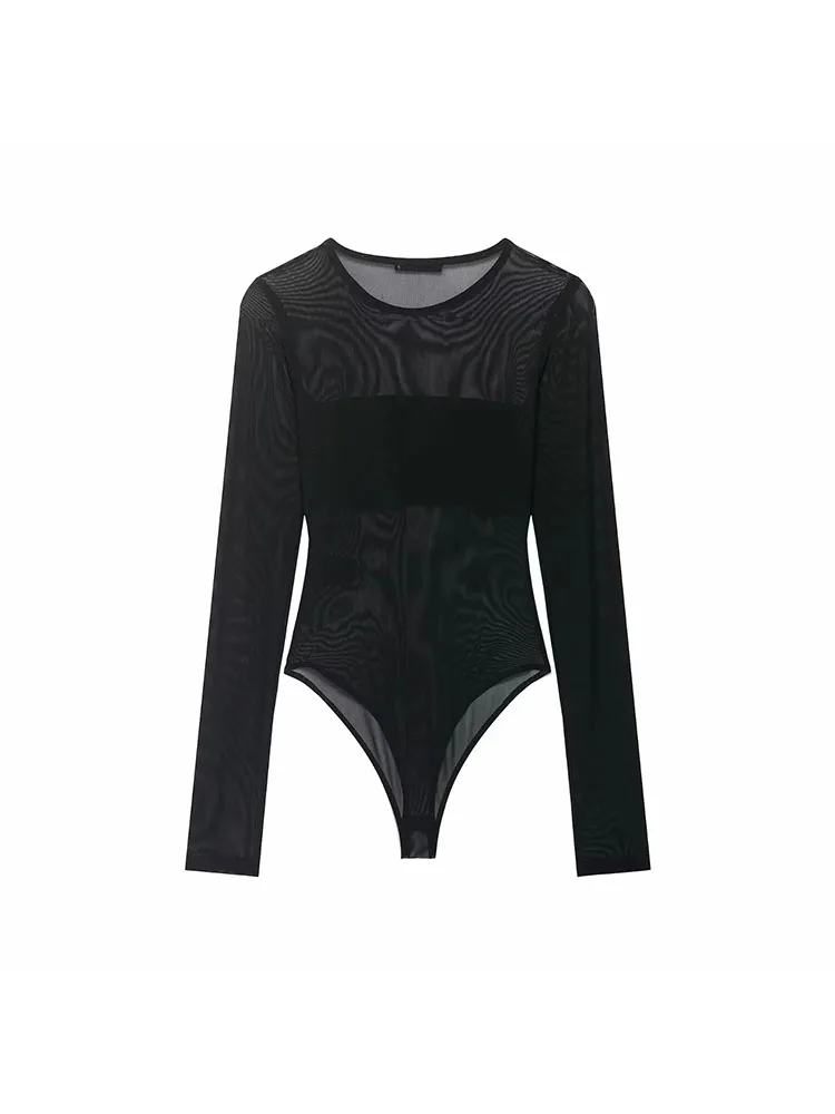 Women Sexy Mesh See Through Bodysuit Women Long Sleeve Sheer Bodysuits O Neck Bodycon Jumpsuit Female Romper
