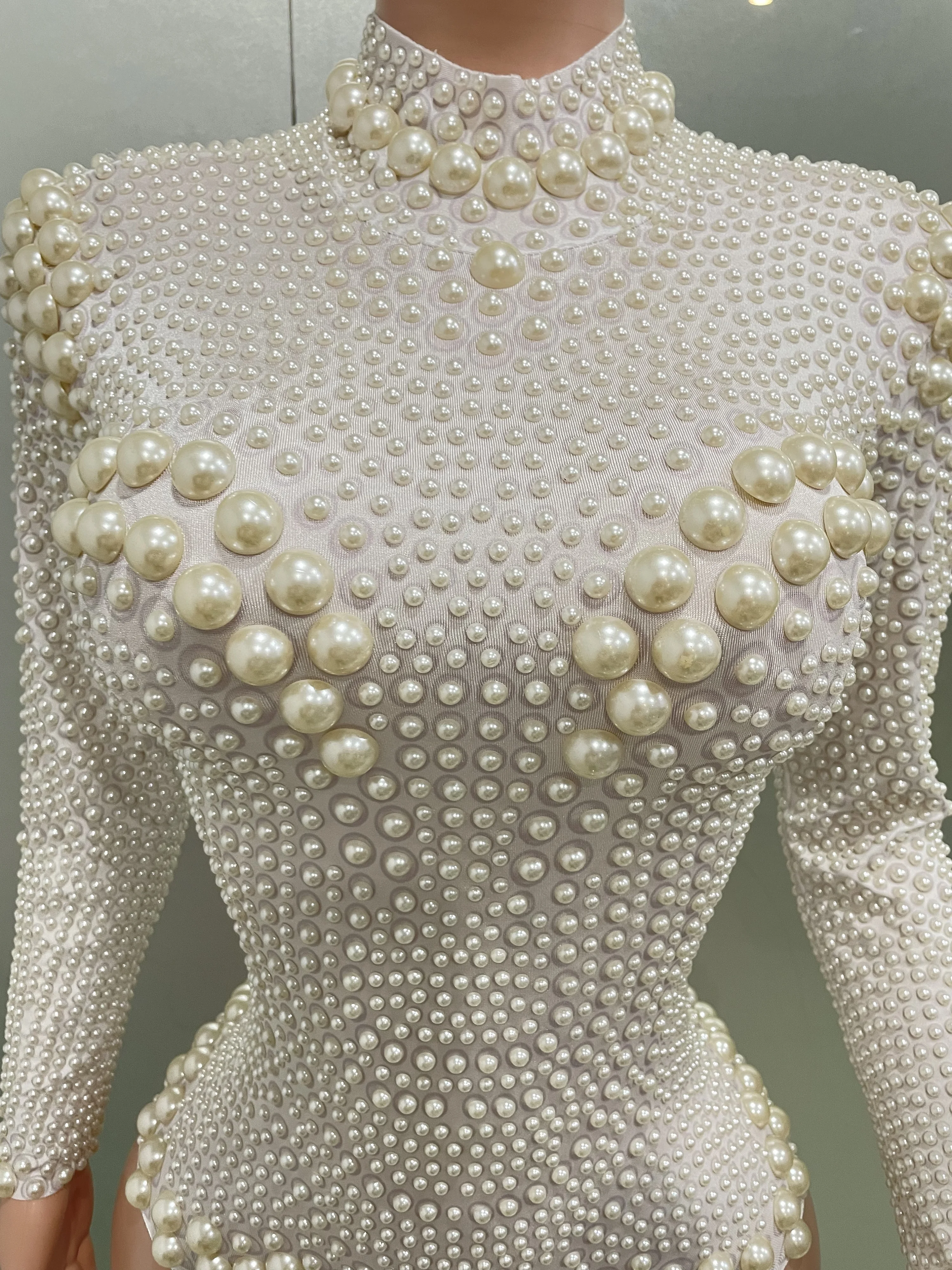 Women Sexy White Pearl Long Sleeved Elastic Tight Fitting Jumpsuit Club Party Dress DJ Female Singer Stage Performance Dress
