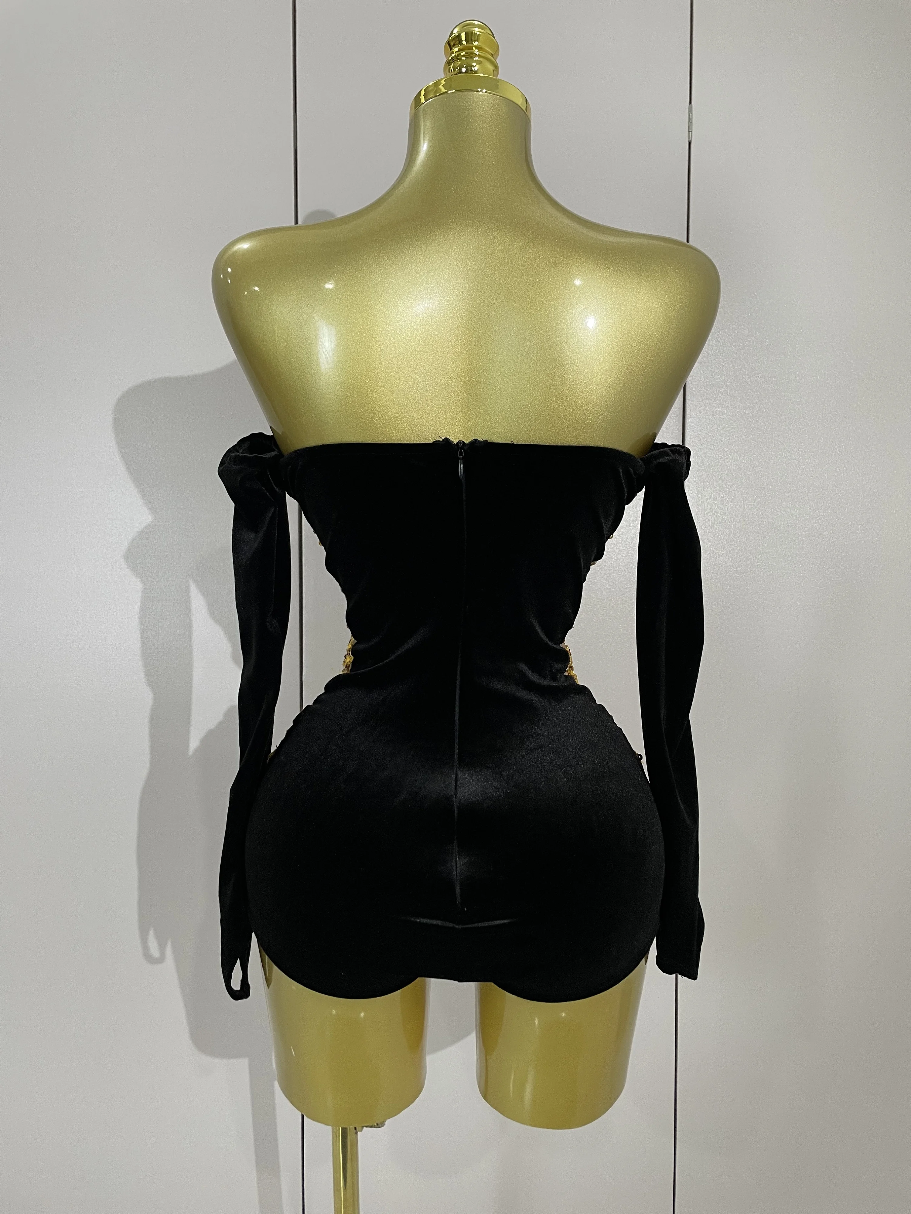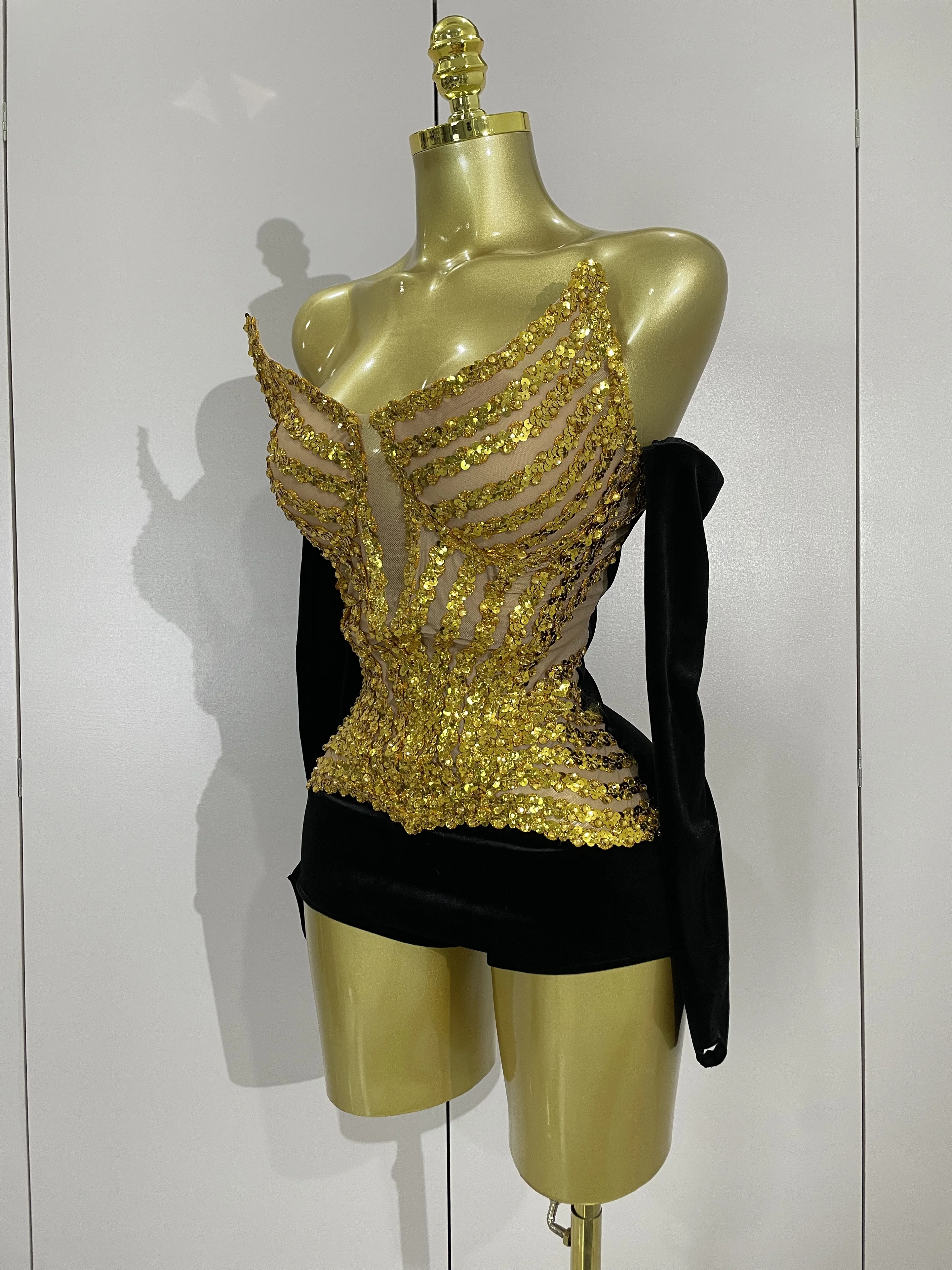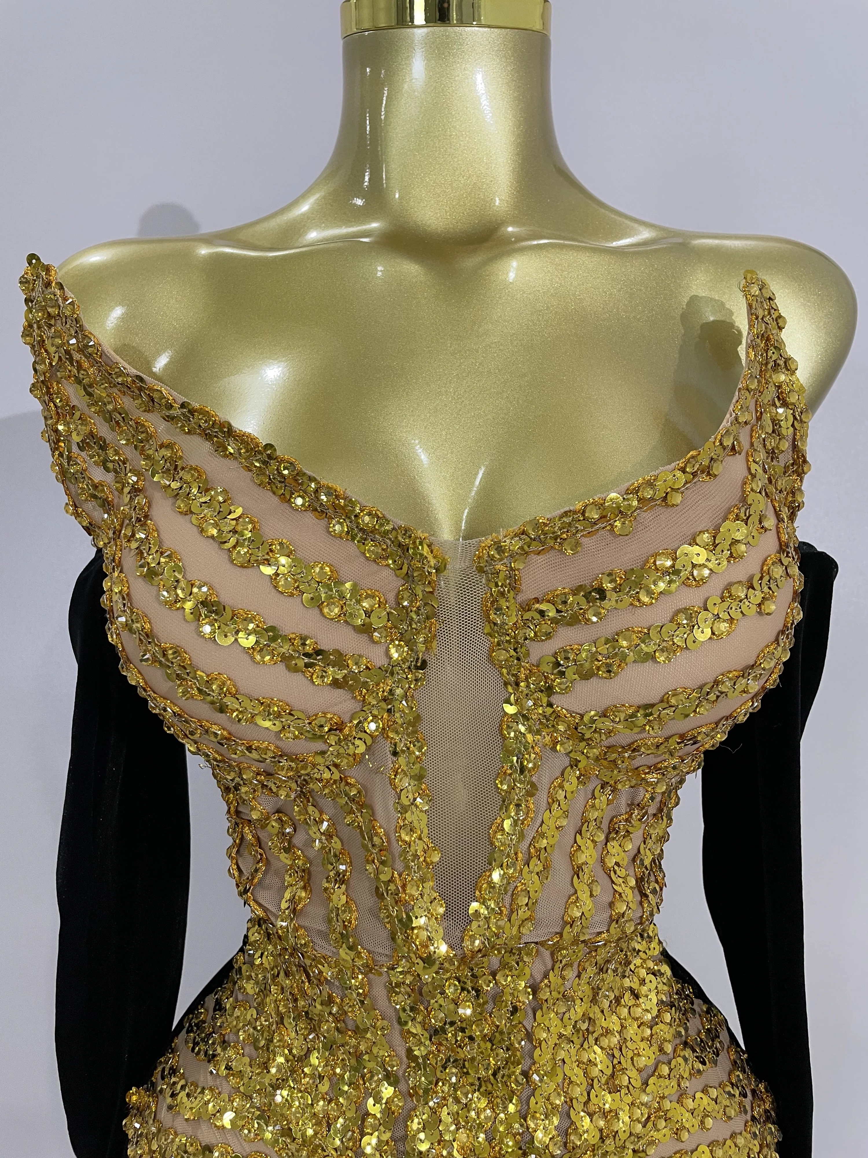 Women Shiny Golden Sequins Sexy Strapless Bodysuit With Gloves Celebrity Elegant Evening Party Birthday Dresses Stage Costume