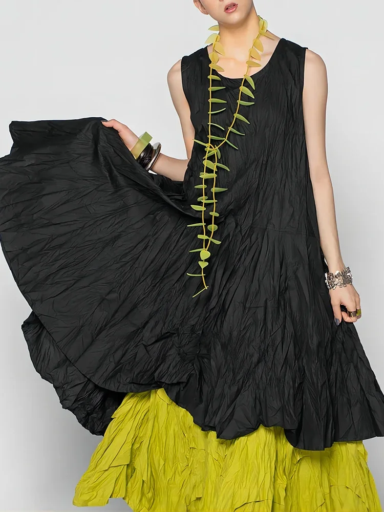 Women Summer Cake Dress Casual Round Neck Sleeveless Fake Two Pieces Gathered Indie Folk Patchwork Loose Maxi Dress Plus Size