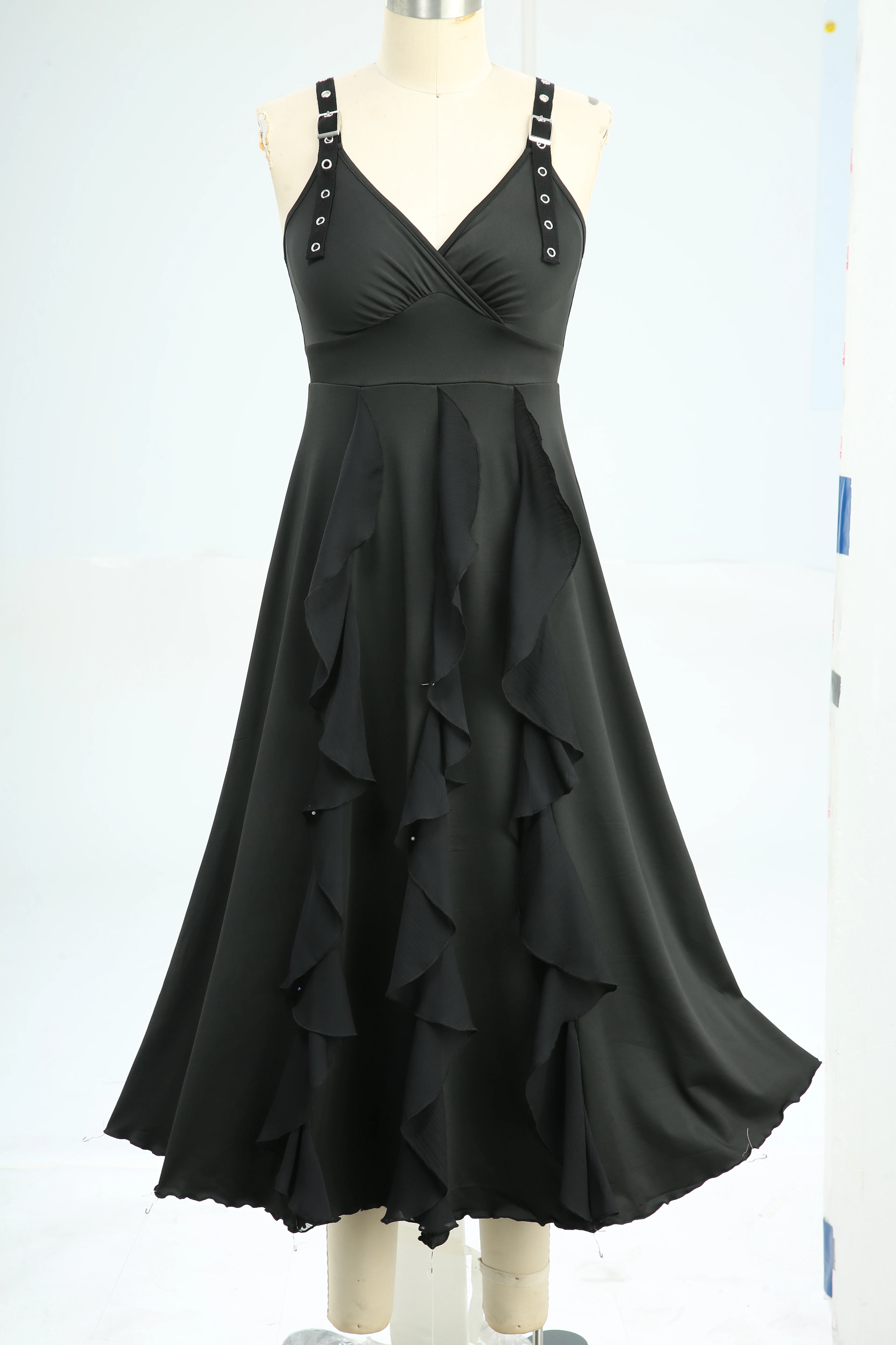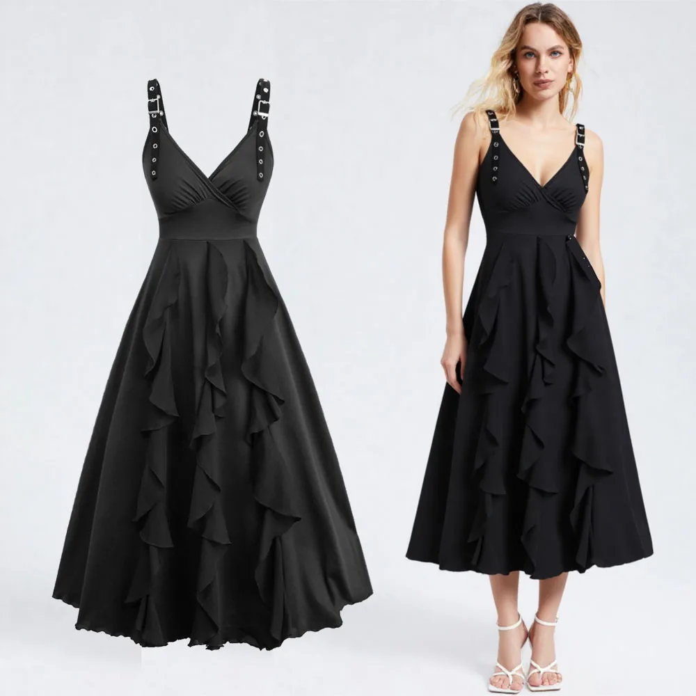 Women Summer Casual Dress Black Ruffles Surplice Straps Buckle Grommet A Line Party Dress Vestidos Costume