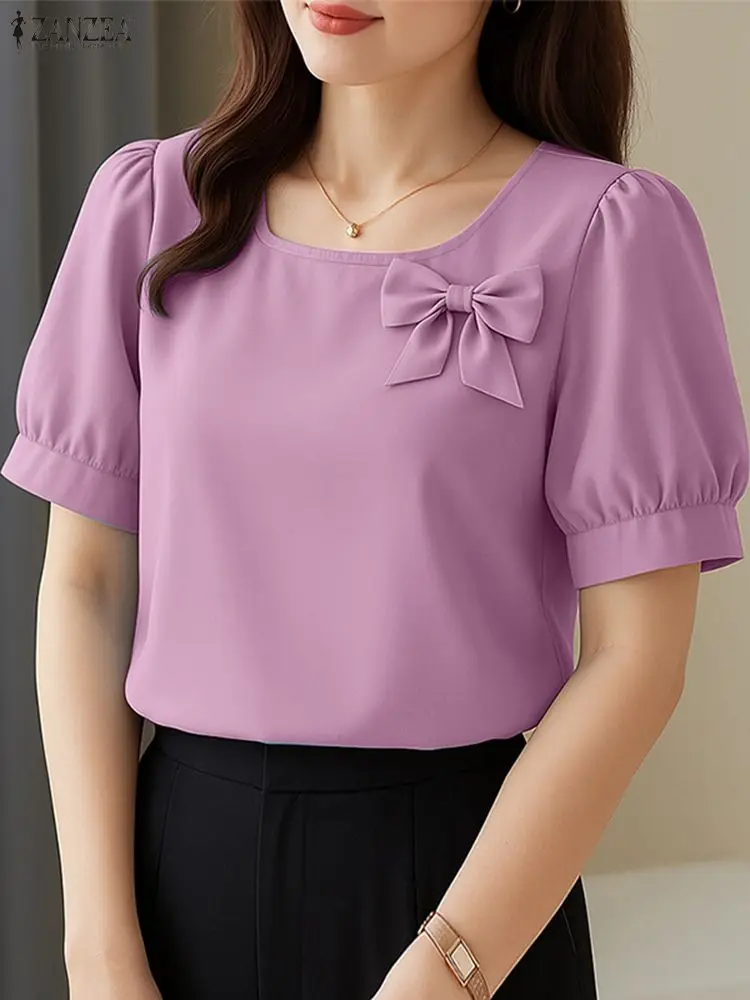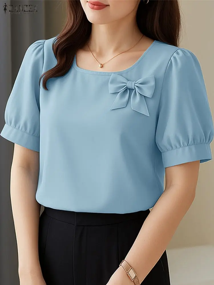 Women Summer OL Work Blouse 2025 ZANZEA Stylish Shirt Elegant Casual Short Sleeve Solid Color Tunic O Neck Blusas Mujer Femme