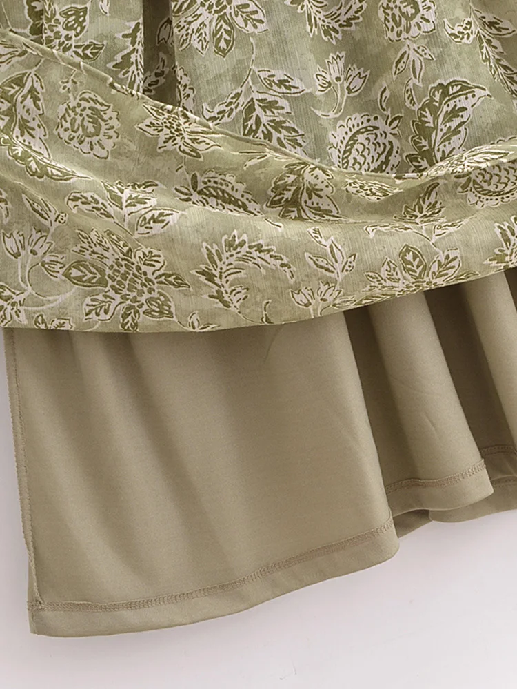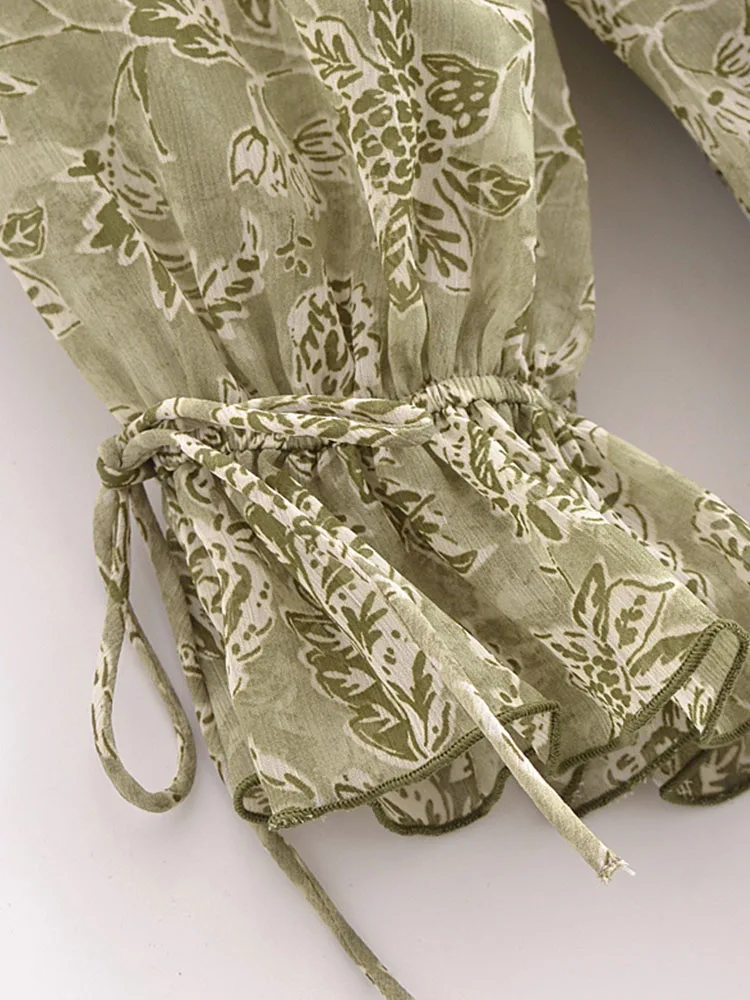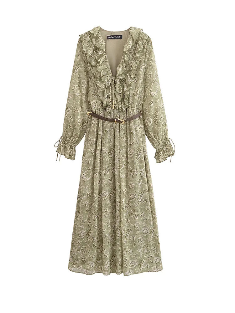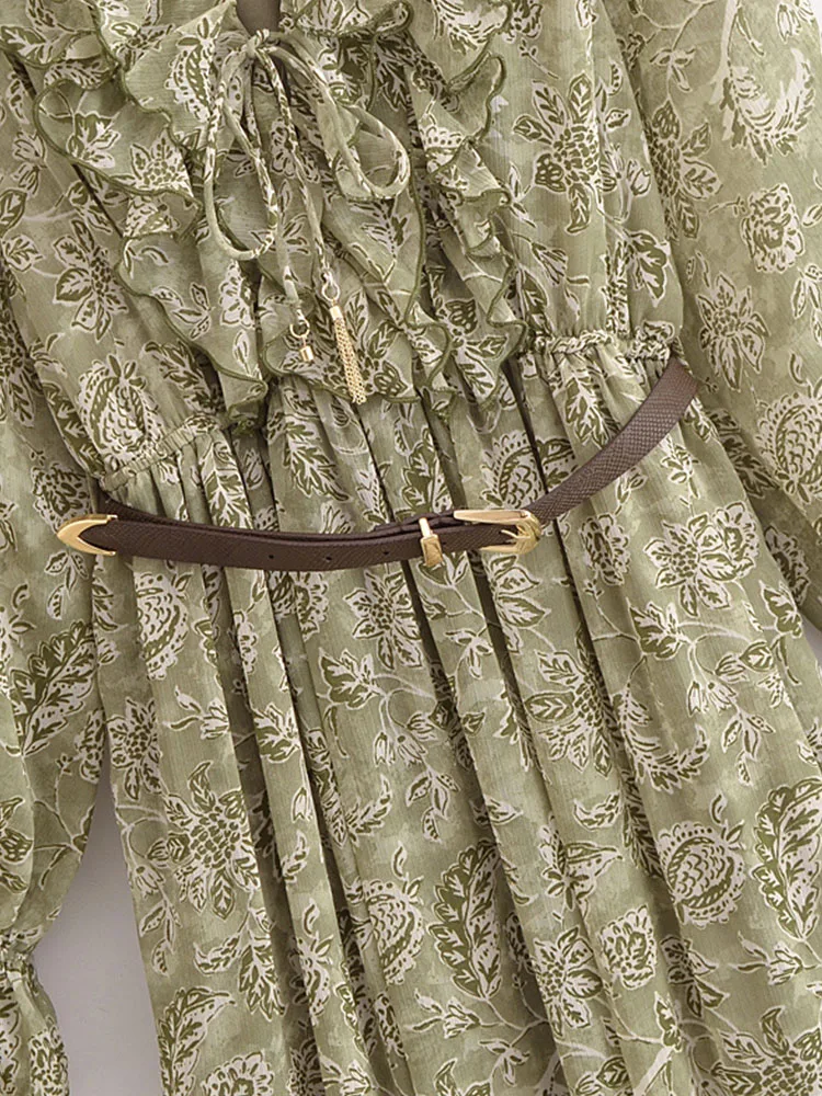 Women Summer Print Dress 2025 Vintage Cascading Ruffle Belt Bwo Long Sleeve Female Elegant Street Dresses Clothing