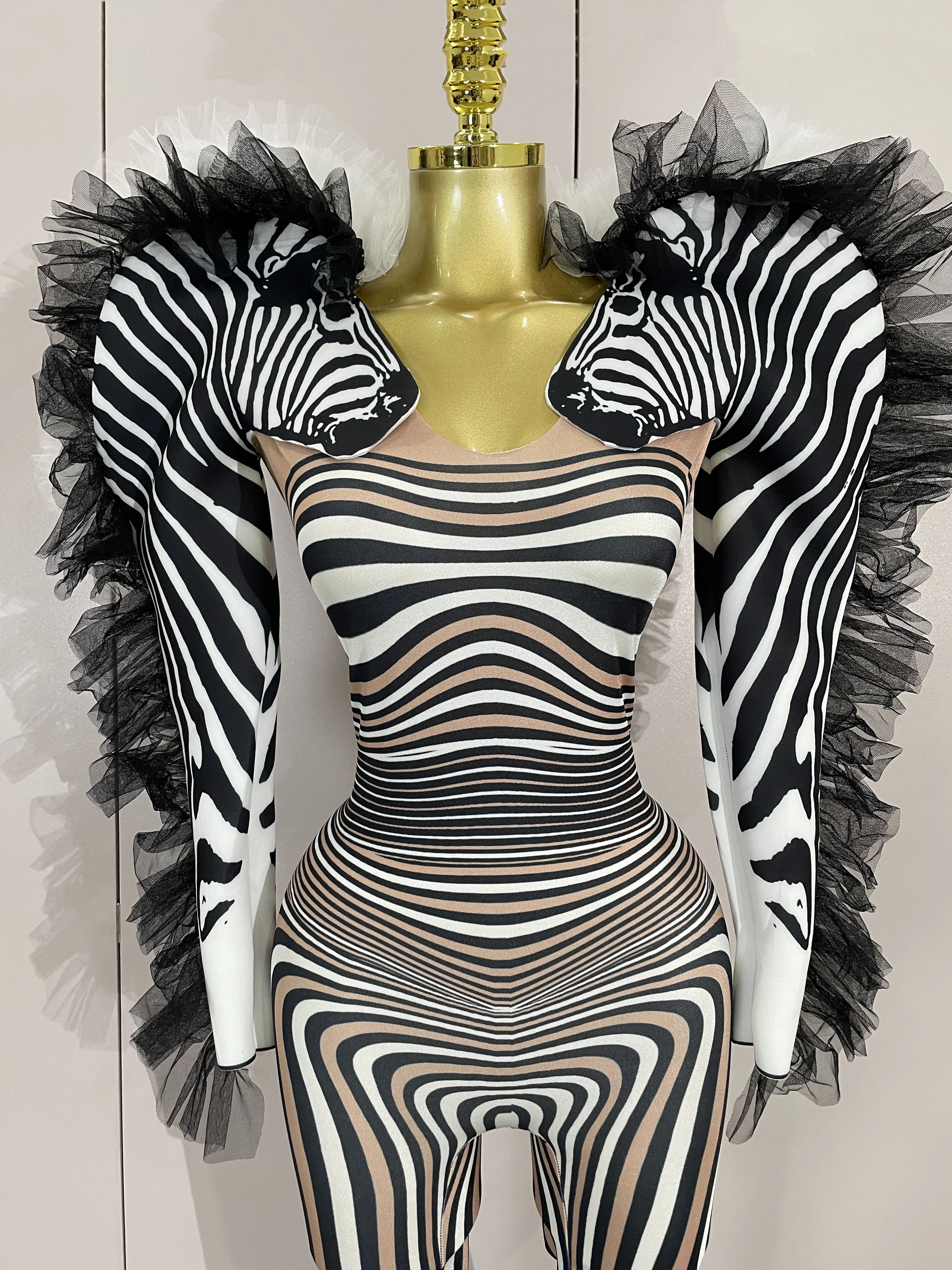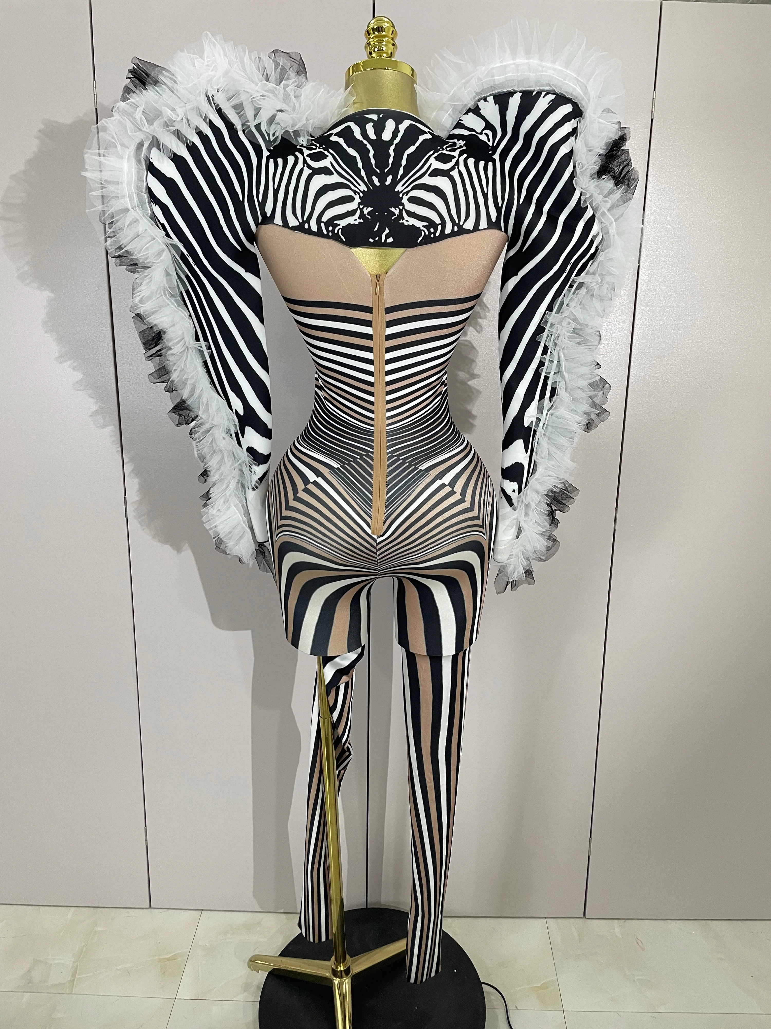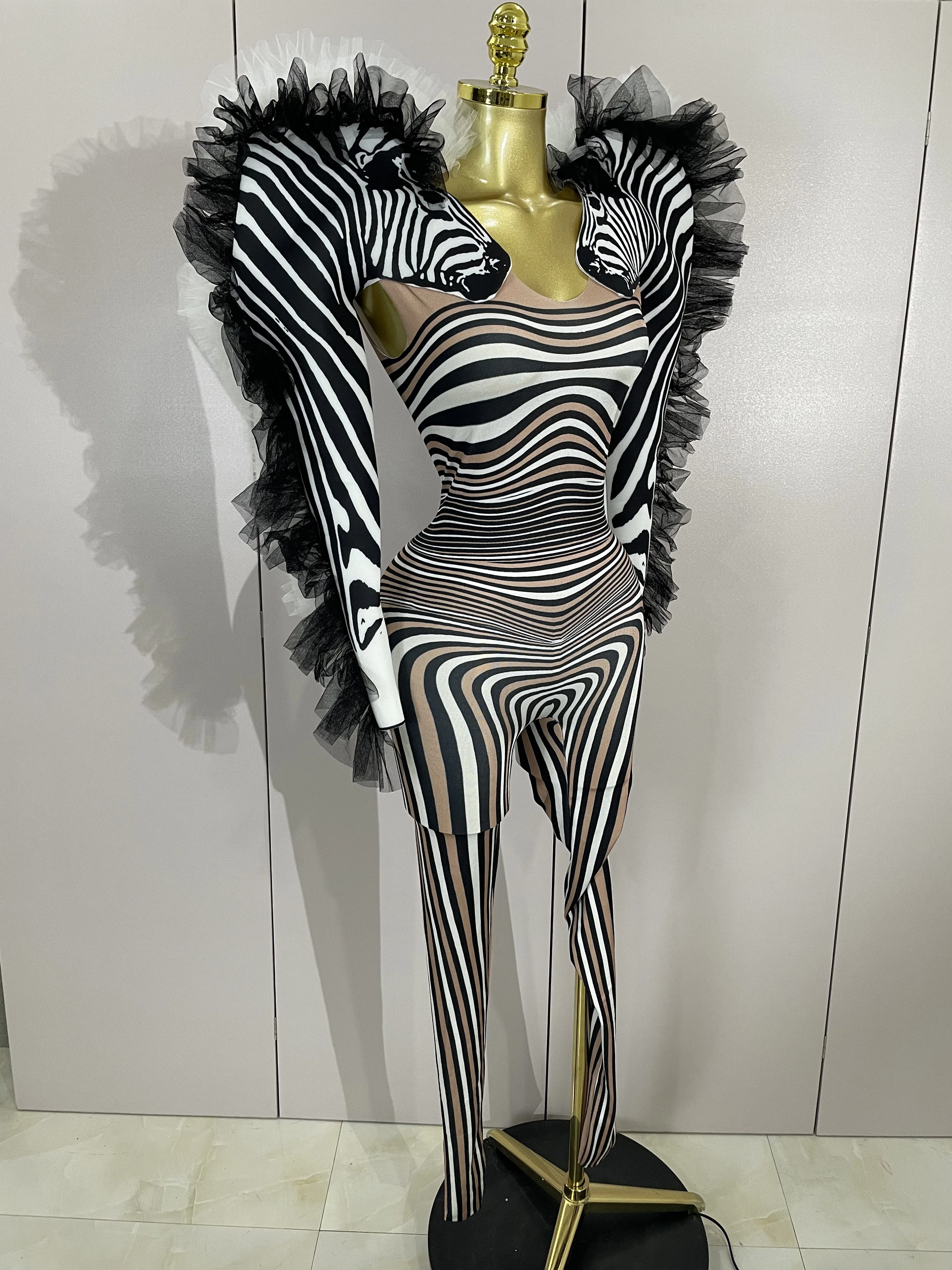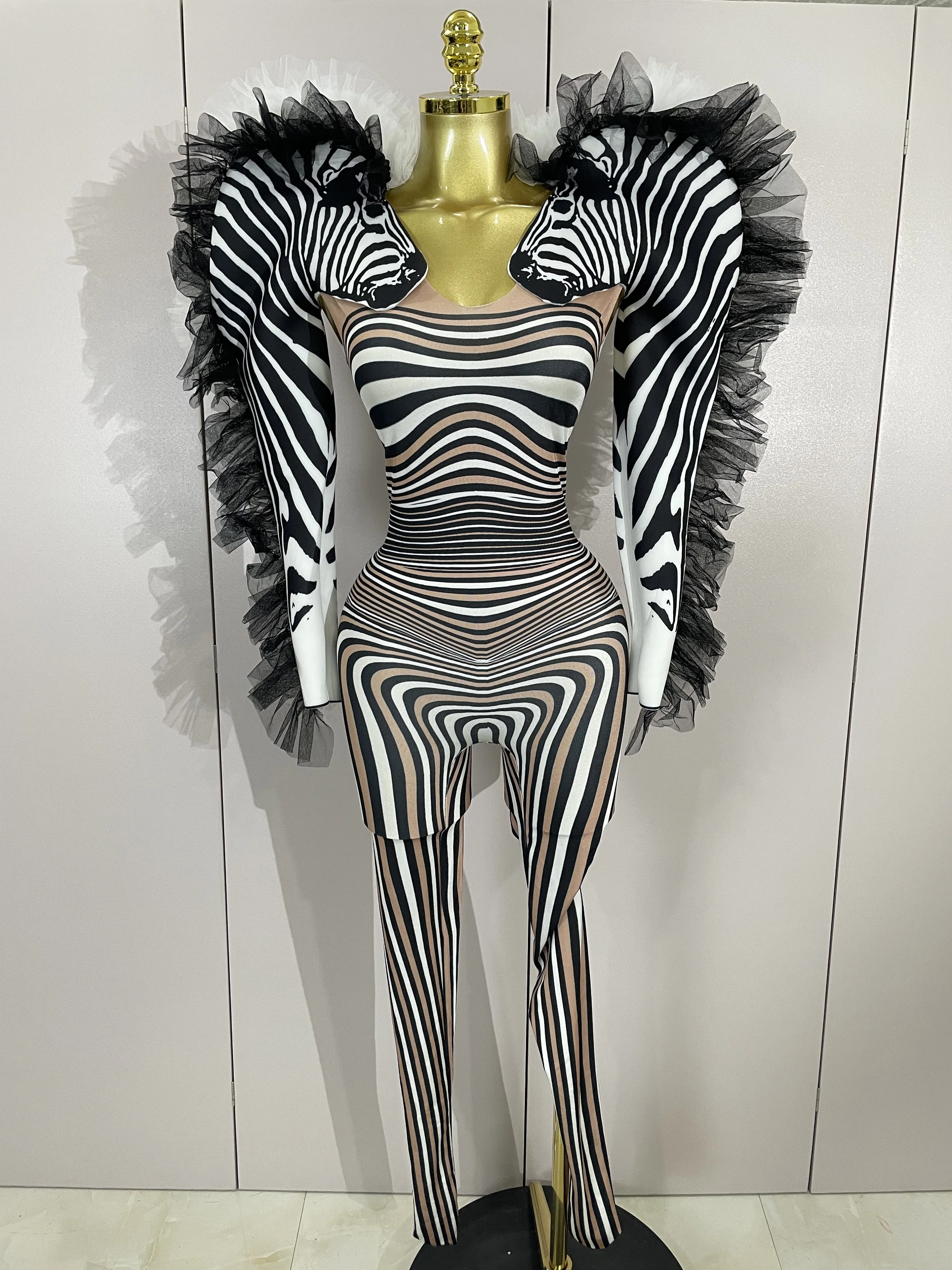 Women Zebra Stripes Long Sleeve Bodycon Jumpsuit Two Piece Set Birthday Party Nightclub Stage Performance Festival Rompers
