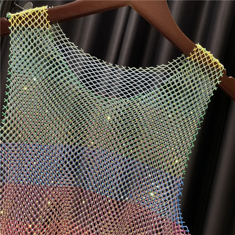 Women&Men Neon Crystal Colorful Rhinestones Shiny Sexy Y2K RainbowTank Tops Party Club Sexy See Mesh Hollow Out 65cm long