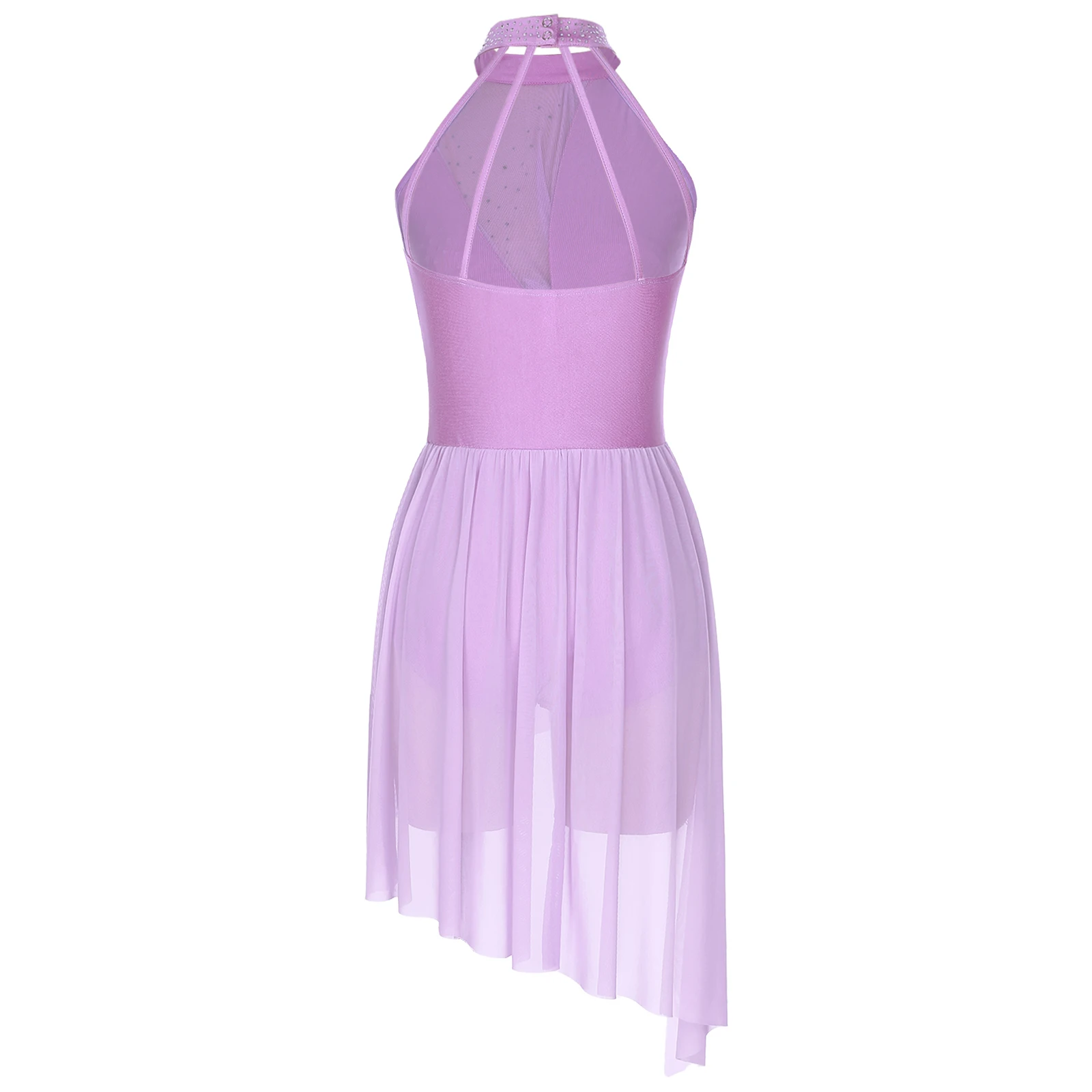 Built-in briefs provide extra coverage. A layer of mesh skirt with flowy and asymmetrical hem shows the beauty of dance.