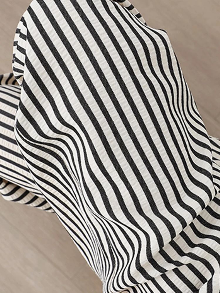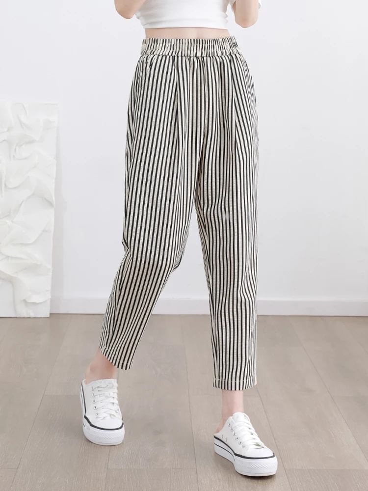 Women’s Casual Vertical Striped Comfortable Breathable Elastic Waist Belted Daily Wear Casual Tapered Crop Pants With Pockets