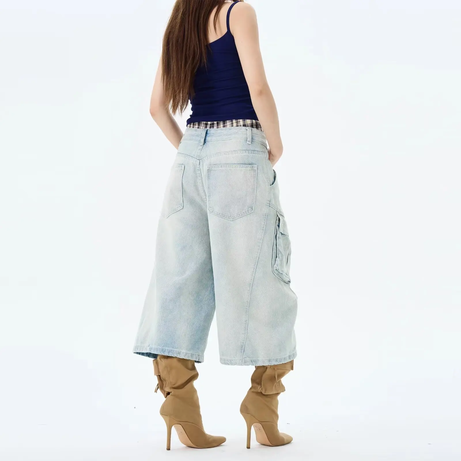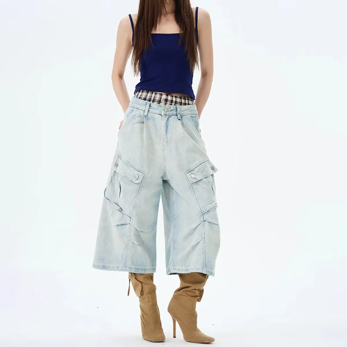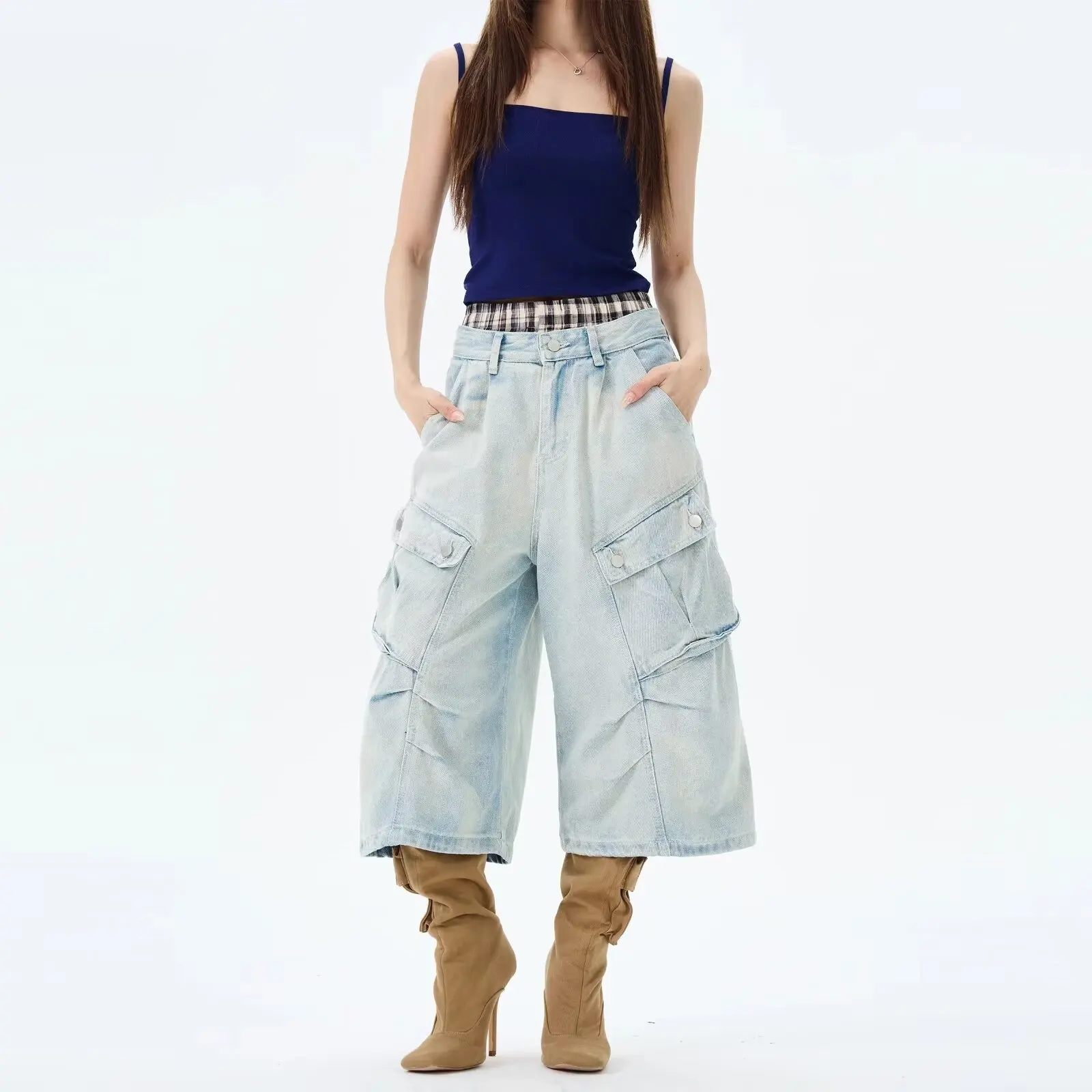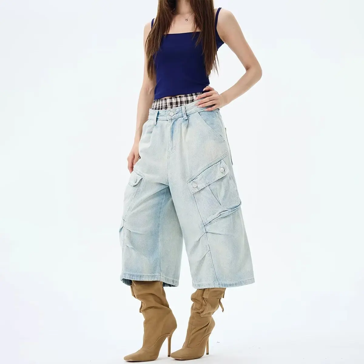 Women’s Clothing Plus Size American Style Multi Pocket Denim Shorts Summer Oversize All-match Jeans for Women Y2k Loose Pants