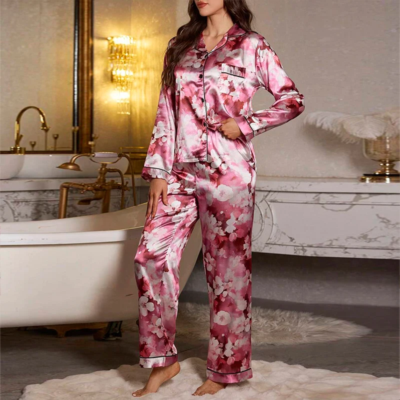Women’s Color-Blocked Floral Print Pajama Set Satin Long Sleeve And Pant For Comfortable Sleep Soft Loungewear And Sleepwear Pjs