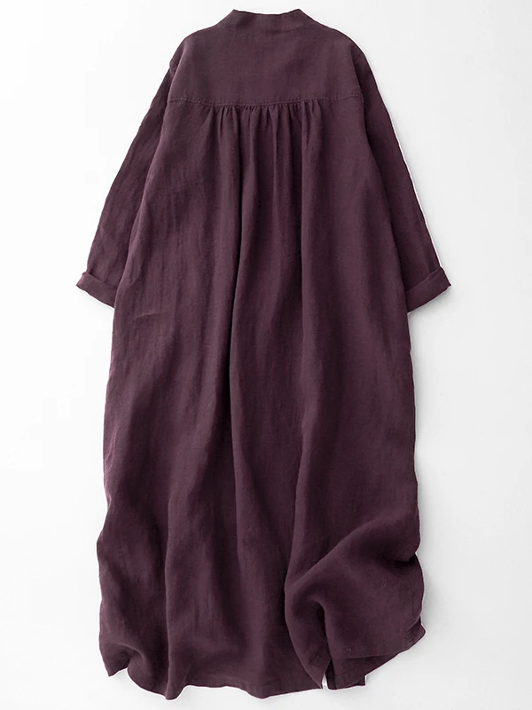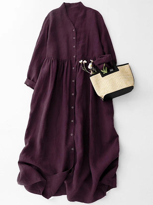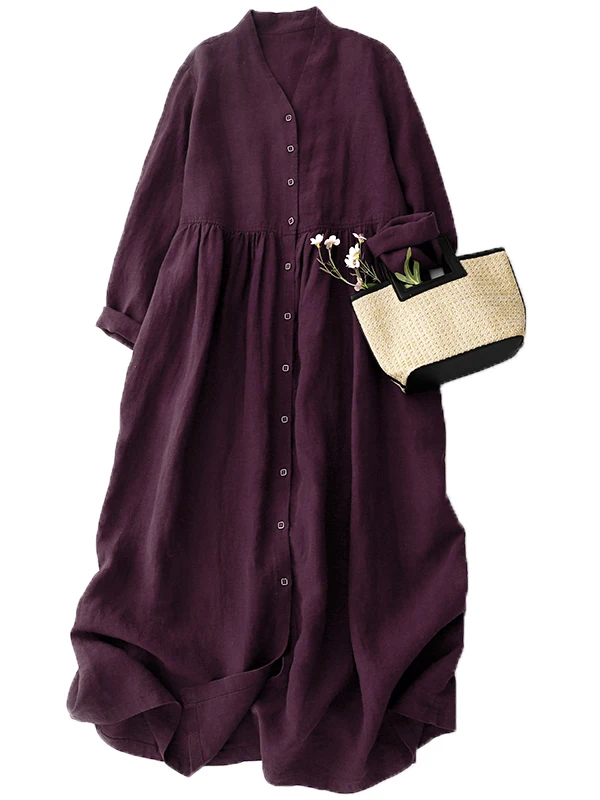 Women’s Cotton Linen V-Ne Dr Two-Way Wear Long Sve Gown Button Sle A-Line Skirt Casual Commute Wind Spring Faion