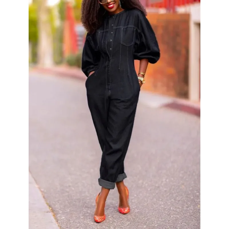 Women’s Denim Jumpsuit Round-Neck Buttoned 3/4 Puff Sleeves Loose Fit Casual Streetwear Fashion Romper One-piece Outfits