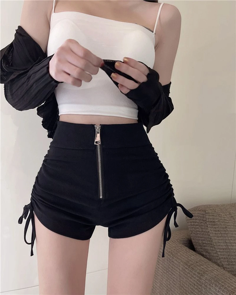 Womens Korean Drawstring Sexy Shorts Harajuku Zipper Lace-Up Yoga High Waist Pants Ladies Skinny Streetwear Shorts Plus Size