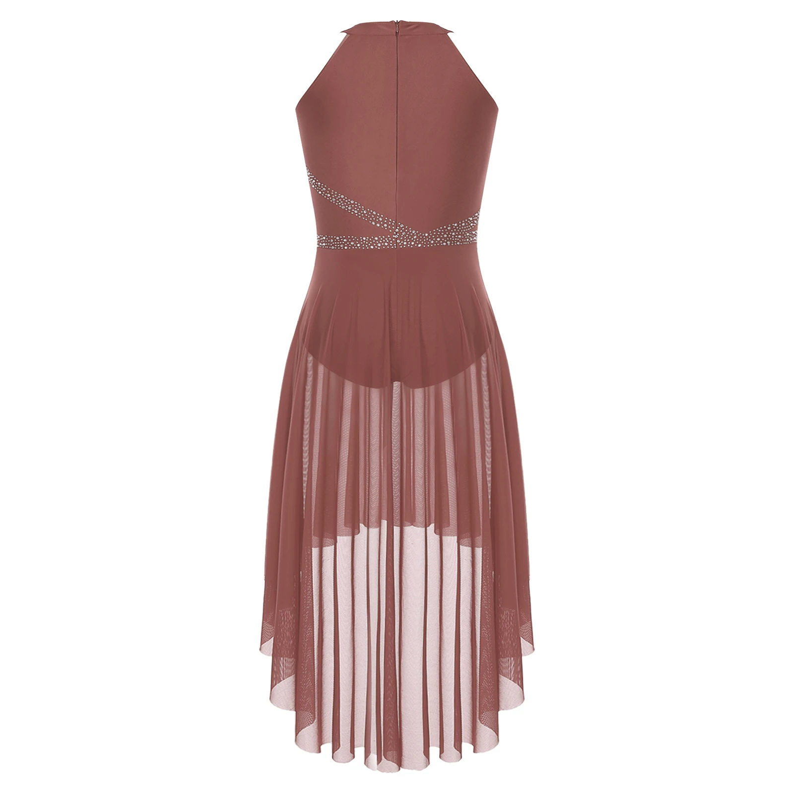 #S-XXL Womens Shiny Rhinestone Sheer Mesh Dress Open Back Asymmetrical Hem Sleeveless Dress for Figure Skating Dance Performance